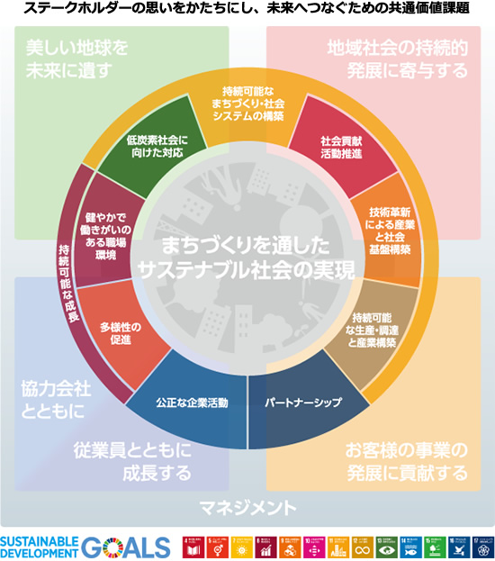 私たちは、サステナブルな社会の実現に向け、「地球環境」「地域社会」「お客様」「従業員」「協力会社」などのステークホルダーの期待に応えるとともに、その人々が集い、作用し合う「まち」が、今も未来も豊かで、安全で、優しいものでなければならないと考えています。そのために、ステークホルダーとの対話をより一層深めていきます。そして、その「想い」を建築、土木、不動産・開発、ファシリティマネジメント、リニューアルといった当社グループの事業力を組み合わせた新たな価値をもつ「まちづくり」を通してかたちにし、サステナブル社会を実現していきます。