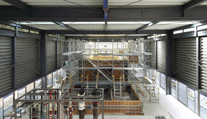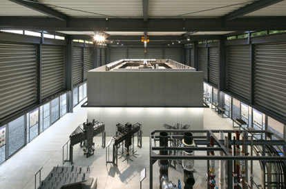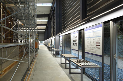 建築の品質のつくり込みのプロセスを確実に次世代に伝承することを基本方針とし、「見て・触れて・体得する」という体験型研修をコンセプトとした研修施設です。半屋外の研修・展示空間は、自然の恵みを最大限に取り込み、親自然で環境負荷の少ない快適な大空間とし、その中に実物大躯体モックアップや各種実大モデル、内部建屋を入れ子状に配置しました。ものづくりの技術を五感を研ぎ澄ませて学び、次世代に継承する人材育成の場となることを目指しました。