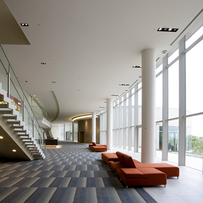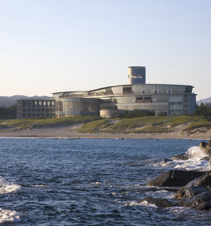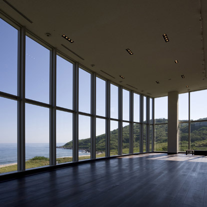 「鳴き砂」と「碧い海」といった自然に恵まれた環境との調和を図るため、建物の形態は、砂浜に風の流れによって描かれる風紋を連想させ、やさしく自然につながることを意識しています。内部は、「研修」「宿泊」「エントランス」各ゾーンを地形になじませた配置とし、あらゆる空間で「海との対話」が出来るようにしました。