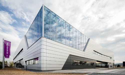 - ・2つ目は「NEXENタイヤドイツテクニカルセンター」という韓国企業の欧州初のR&D施設です。創業家出身の社長より、欧州における今後のビジネス拡大を象徴するような、勢いのある建築を求められました。外装は全周にわたってタイヤのトレッドを想起させる、一筆書きの力強い表現で包み込み、外装全体でコーポレートアイデンティティを表現しました。建物の中核には、レセプションで数百人が集まることのできるおおらかな気積のアトリウムを設けました。