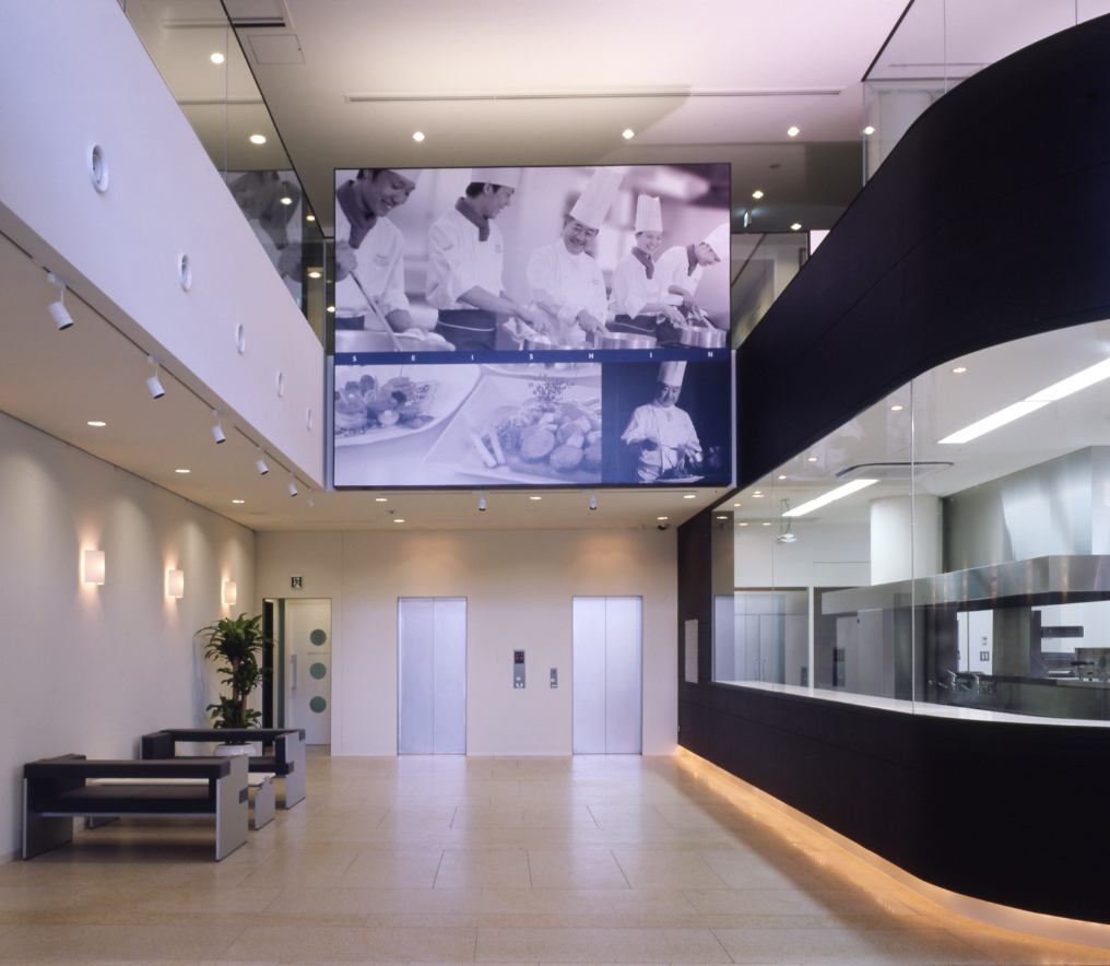 - ・20代の終わりに第一子を出産。同じマンションに住む両親の⽀援を受けながら設計部に復帰し、調理師専⾨学校の設計を竣⼯まで担当しました。都内駅前のコンパクトな敷地の制約の中で、和・洋・中の各分野の先⽣⽅から様々な要望を伺い、相反する条件や課題を解きながら設計を進めました。カラースキームやサインデザインにより、新しい調理師専門学校として若い学⽣の⽅にアピールする空間を提案しました。