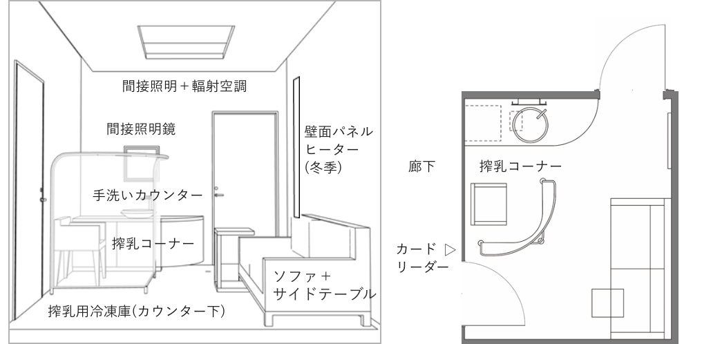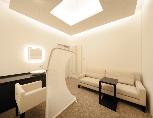 - ・出産・育児の経験を活かして産前・育児中を中心とした女性の要望を形にするため、こまちルームの実施設計にも携わりました。執務空間とは異なる女性にやさしい環境の実現に向け、気流を感じさせない輻射空調や調光可能な間接照明など、業務と体調コントロールを両⽴させるためのきめ細かな配慮を設計に盛り込みました。