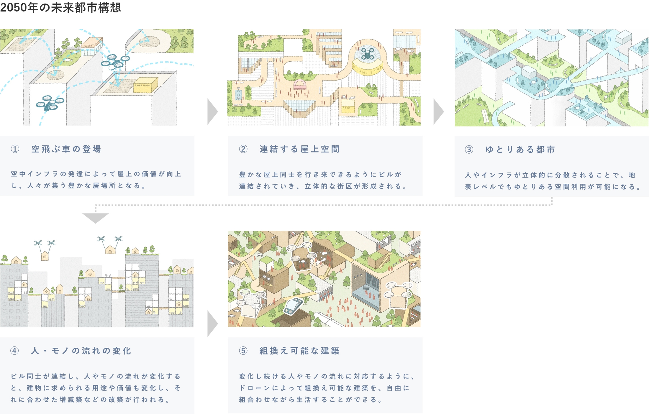ドローンなどの空中インフラが普及した2050年の未来では、建物の屋上同士が連結することで立体的で自由な都市が形成されていく。