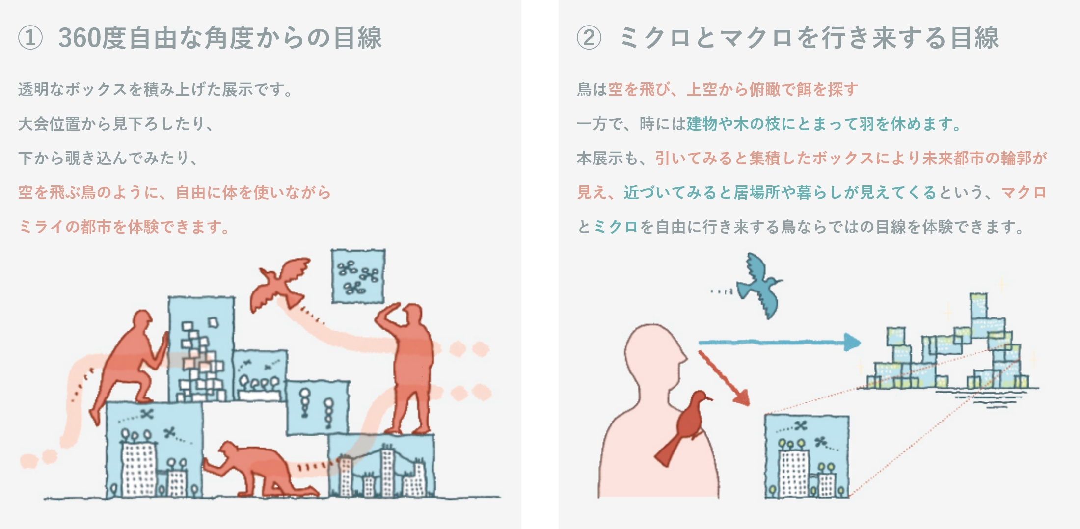「空」から可能性がひろがるミライの都市を体験するために、⼤阪ヘルスケアパビリオンコンセプト「REBORN」・「鳥の巣、タマゴ」から着想を得て、鳥の目線からミライの都市を体験することができる展示を目指した。