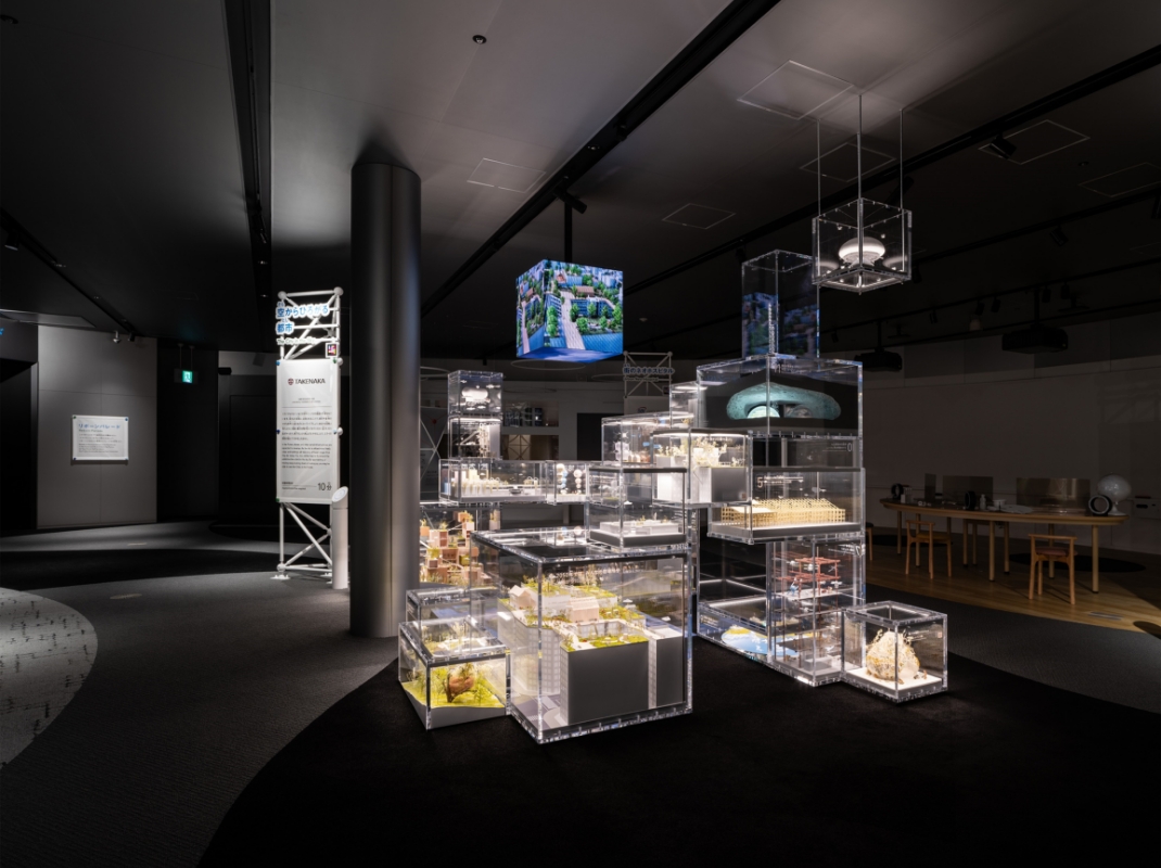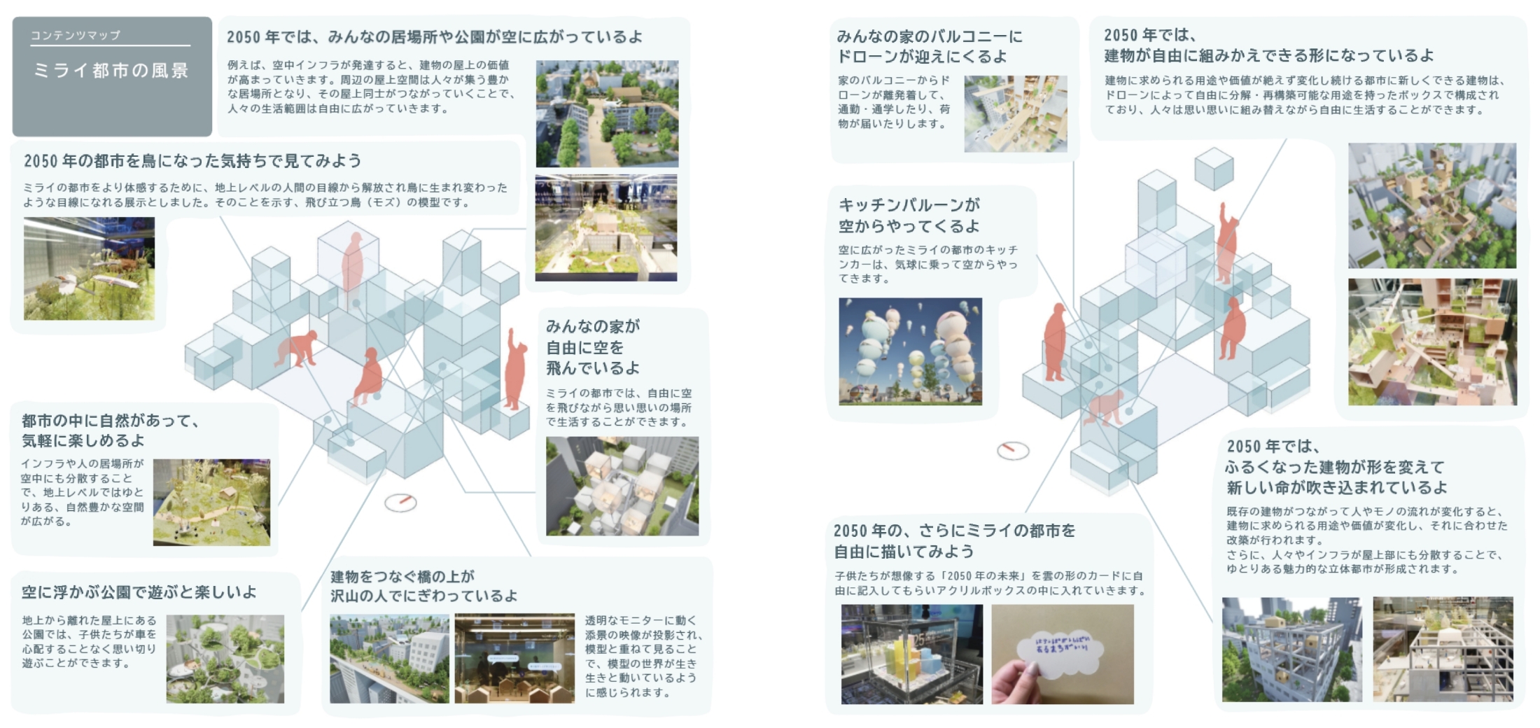 構想した未来の都市で営まれている生活の風景と、未来の都市につながる現在の事例を様々な縮尺の模型としてアクリルボックスに封入し、それらを立体的に積み上げ、ミライのシーンが集積した都市を表現した。