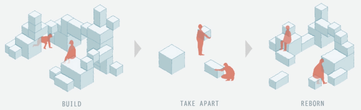 半年間の会期後に多くのパビリオンや展示物が廃棄されてしまうことは、万博において問題視されている課題の一つだ。その課題に対して、本展示は万博会期後は新たな場所で組み替え、生まれ変わる計画としている。展示ボックス同士の連結方法に、容易に分解し、再構築することができるダボ連結システムを使っており、会期後は自由に組み替えが可能なパーツに分解して次なる展示会場にてその規模やプランによって展示の組み方を変えたり、さまざまな場所に分散したり、増殖したりすることも可能である。このサイクルが繰り返されていくことによって、あらゆる場所に展示の足跡を残していく。
