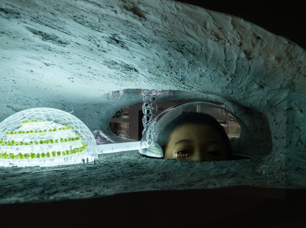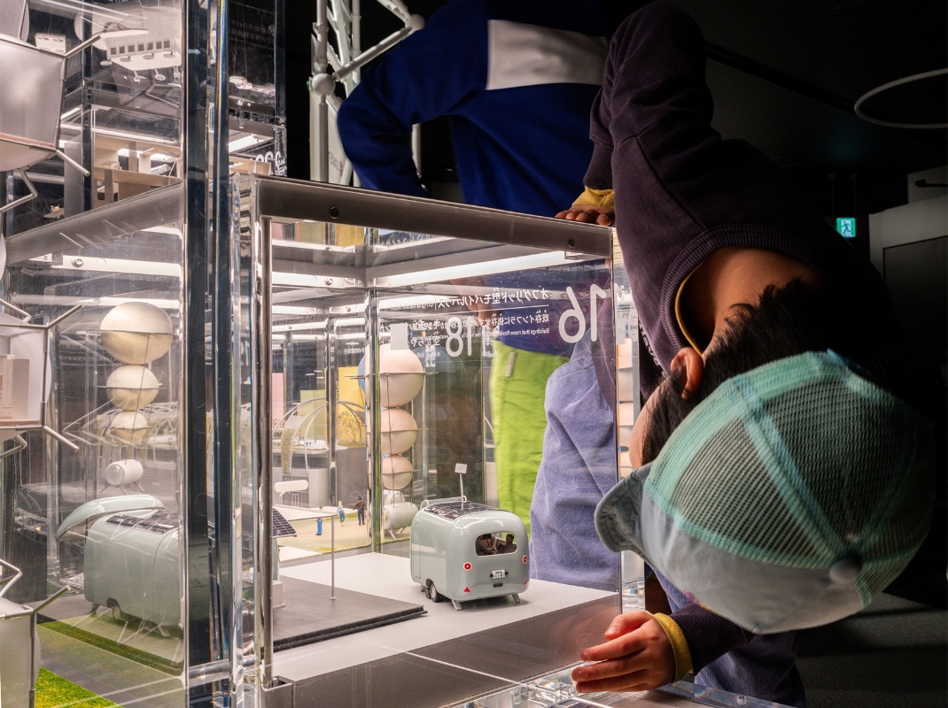 模型の中から顔を出す/ルナタワー(鉛直展開可能な月面居住インフラ)の展示
