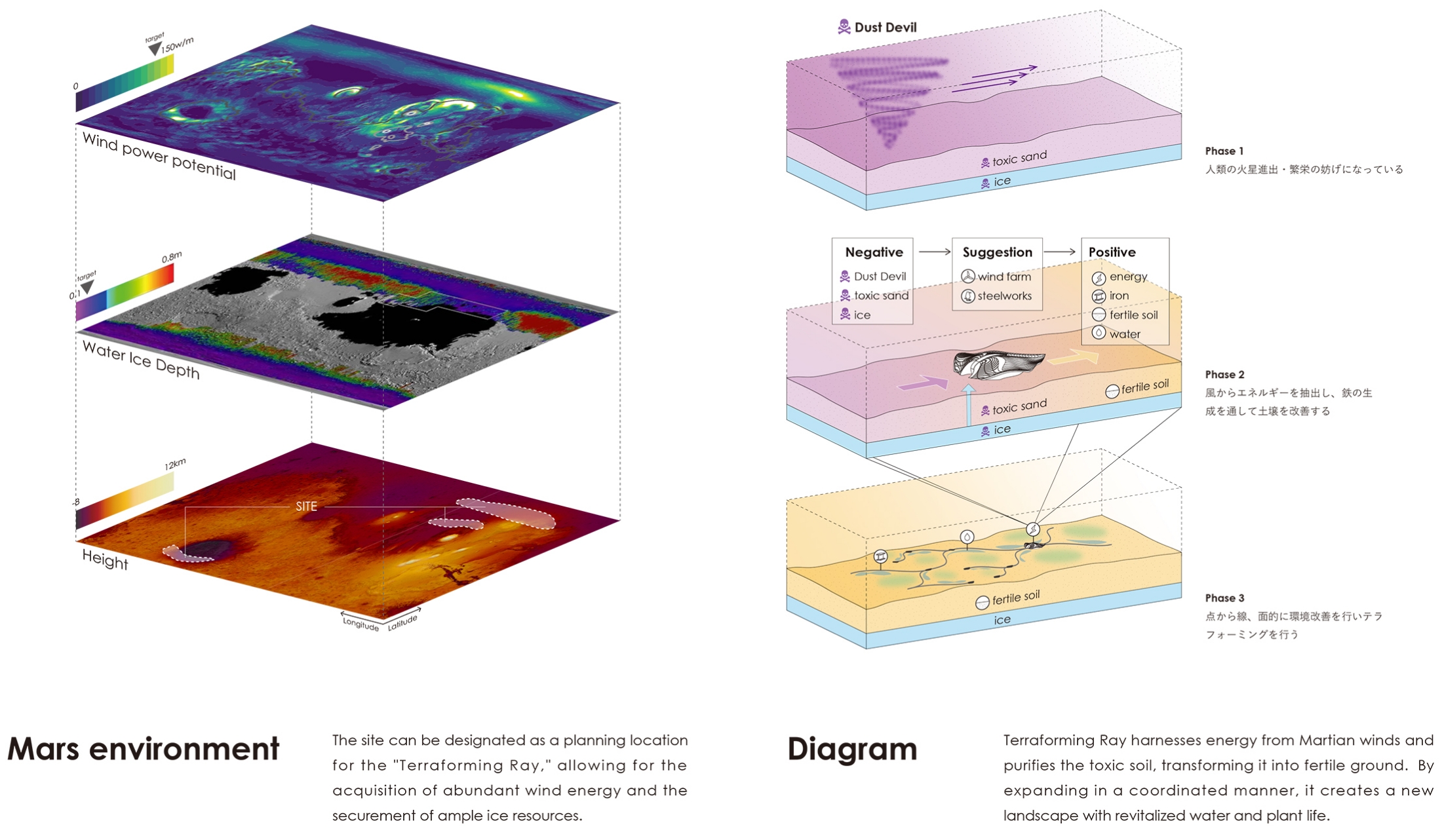 「Terraforming Ray」は火星に人類が居住できる環境をつくる500年先を見据えた壮大な提案である。火星の強風を活用して風力発電を行い、その電力で有毒物質を含む地質改良を行う。さらに地質改良時に発生する熱エネルギーを利用した膜構造で居住空間を創出する。この装置兼建築を展開させ、火星に緑あふれるランドスケープを生み出す。局地建築や膜構造など竹中工務店が蓄積してきた技術を宇宙に展開するアイデアである。火星の風に着目した新規性、造形美が評価された。
