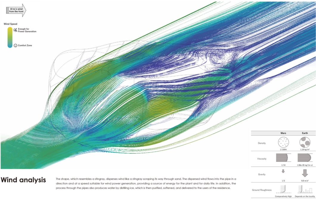 タイトルは「Terraforming Ray(テラフォーミング・レイ)」。テラフォーミングは惑星を改善するという意味があり、レイは魚のエイです。コンペの要項の中で生物を参照することが重要視されており、流体を受け流す形として最適なエイの形状を採用しました 。