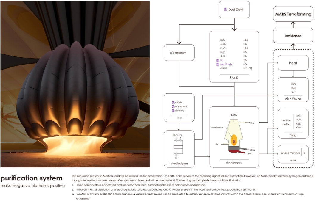 風については、環境の今井さんが行った風の流れの解析結果を基に、風を受け流しつつも風力発電のタービンに効率よく取り入れる形状を考えました。土が有毒な過塩素酸塩を含んでいるという問題については、意匠の大野さんと大学時代に微生物の研究をしていた吾郷さんが、製鉄のようなプロセスを経て有毒物質を取り除き、鉄やゼオライトを取り出す方法を考えてくれました 。