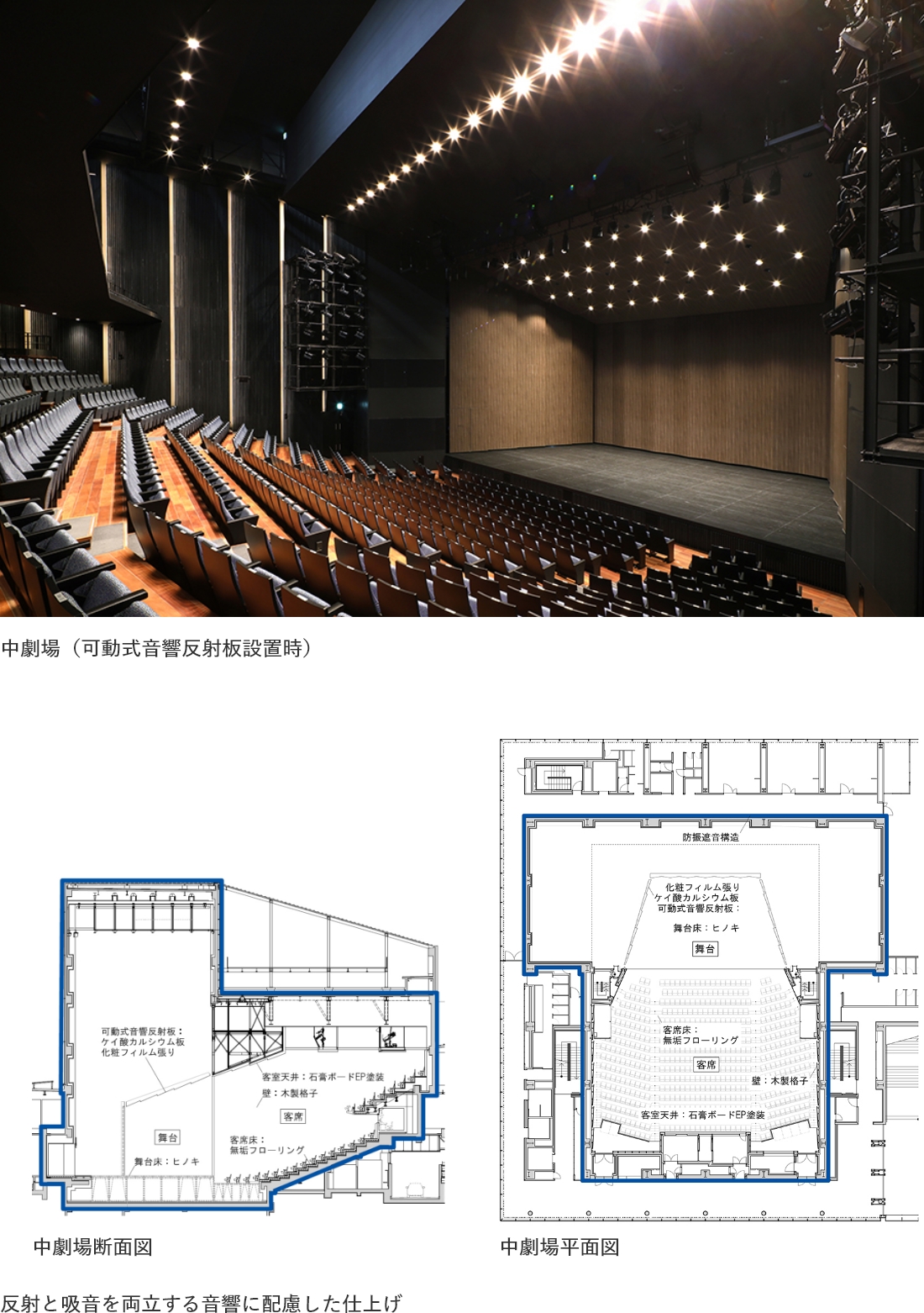 中劇場は、舞台芸術とともに可動式音響反射板設置時にはクラシック音楽など生演奏の響きを重視した空間とすべく、当社の室内音響シミュレーションシステムを用いて音響設計を行いました。舞台から客席天井、壁が一体として繋がる形状を検討することで、客席全体に有効な初期反射音が得られ明瞭かつ豊かな響きを客席に届ける計画としました。隣接する大劇場と中劇場の同時利用を考慮し、中劇場は防振ゴムなどにより躯体と絶縁する防振遮音構造を採用することで、高遮音性能を実現しました。