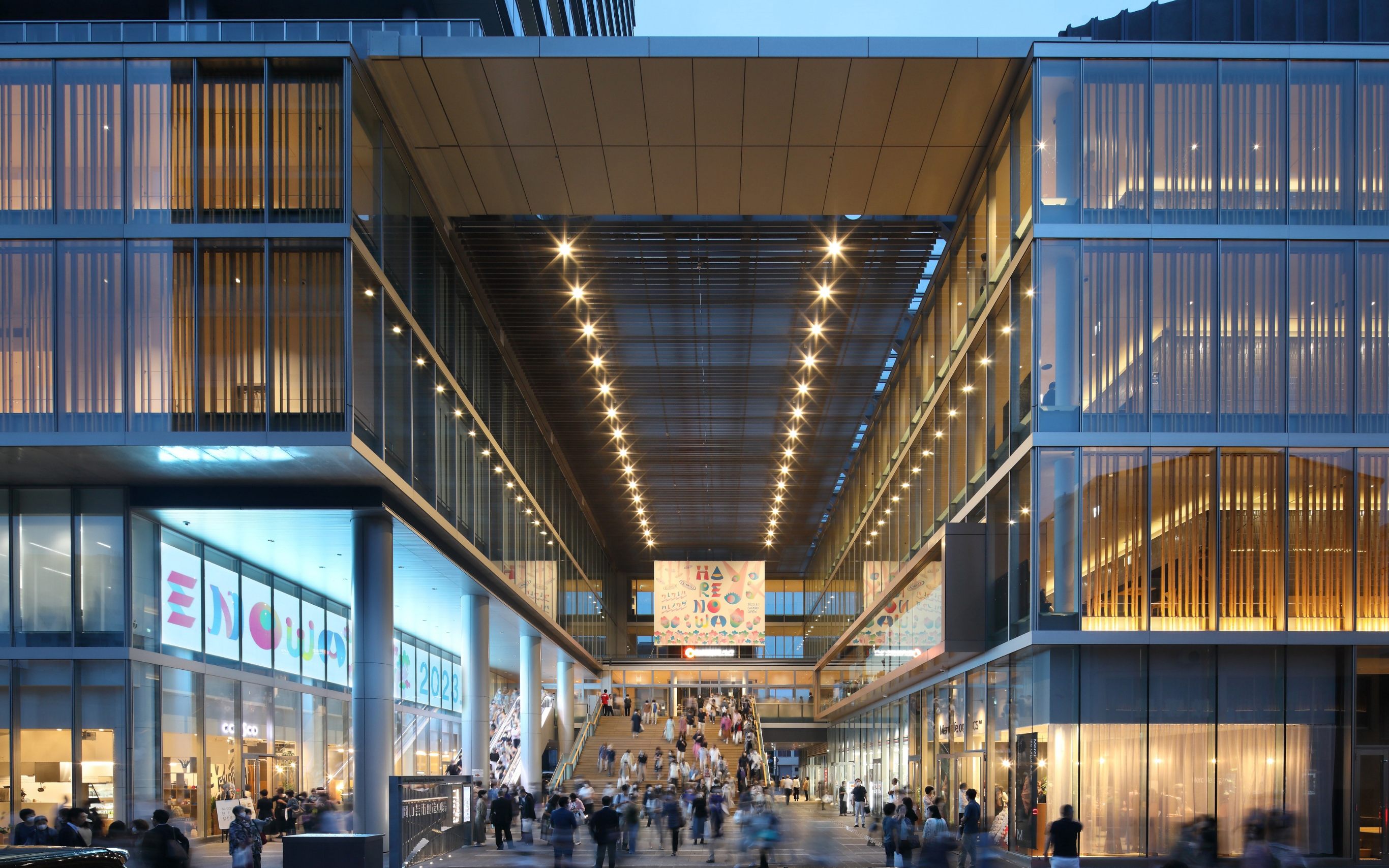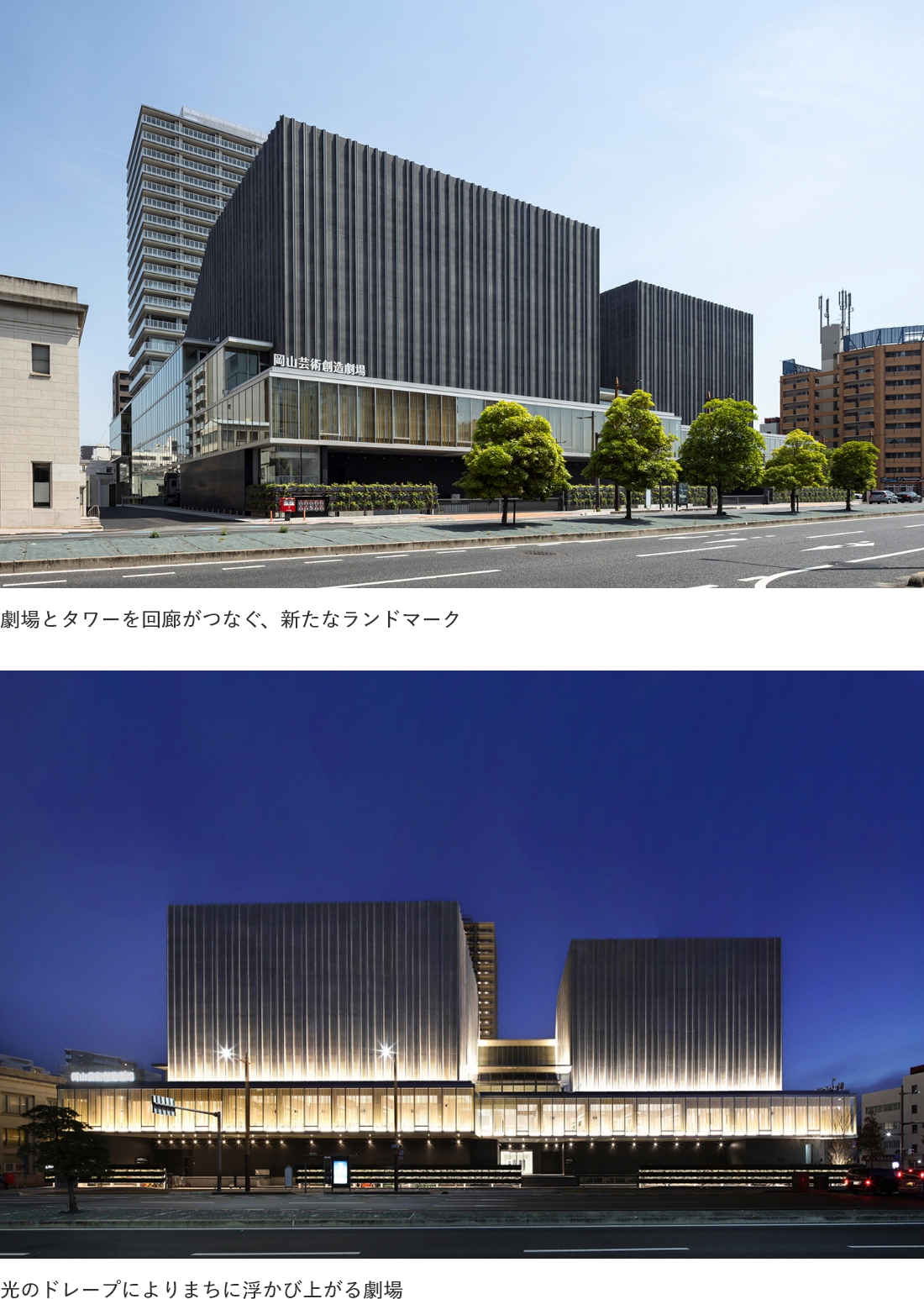 かつては演芸場や映画館が立ち並ぶ繁華街であったこのまちで、市民が日常の中で文化芸術に触れる風景を再構築し、まちのにぎわいを取り戻すことを目指しました。岡山城と後楽園の関係性をモチーフに、劇場と高層棟を大屋根広場と回廊でつなぎ、新しい景観創造と各機能を有機的に融合させました。外装は水平ラインとランダムな縦リブで構成しています。表情を変える陰影が劇場の創造性と祝祭性を表現し、まちの新たなランドマークとなります。