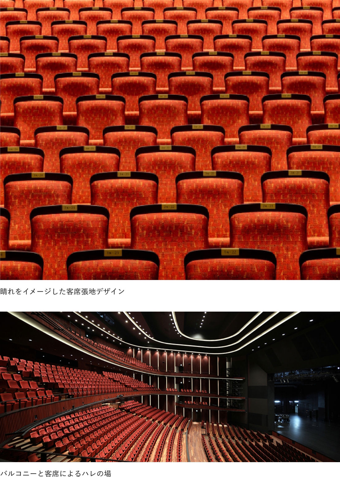 大劇場客席は、馬蹄形バルコニーに合わせ緩やかにカーブを描いて配置しています。3層に積み重なる1750席の客席は、どの席からも見やすいよう綿密に視線検証を行い配置を決定しています。客席背板はバルコニー形状に呼応したカーブとすることで、隣席との抜け感を生み出しました。張地は太陽の光やプリズムをイメージし、見る角度によりその煌きが移ろうテキスタイルデザインとしました。客席が劇場内装と一体となり、「ハレの場」を鮮やかに彩りました。