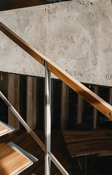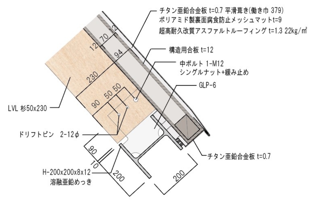 部材同⼠の接合部は、ボルトやビス、ドリフトピンを露出させた納まりとすることで、修繕のしやすさや、将来の解体、⼆次利⽤を見越したデザインにしました。ボルトやビスの見え方まで検討し、建設工事に携わる会社の建物として、無骨で工業的なディテールとしました。