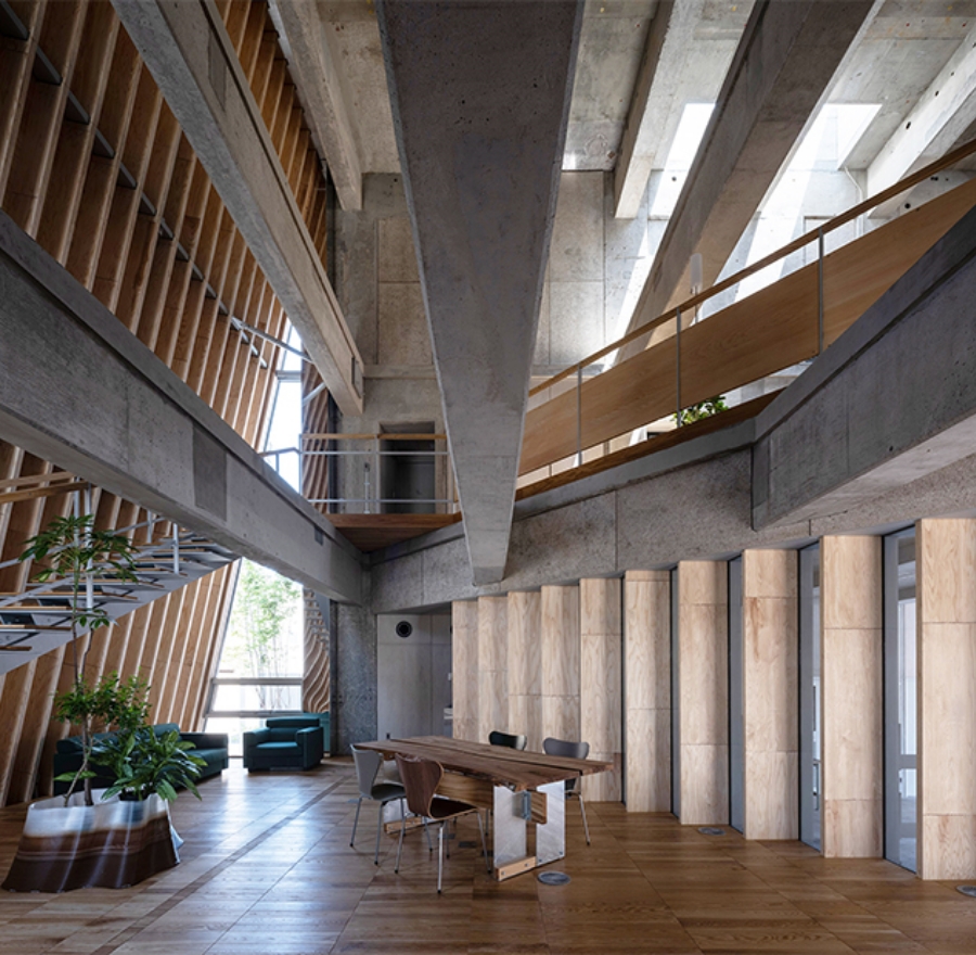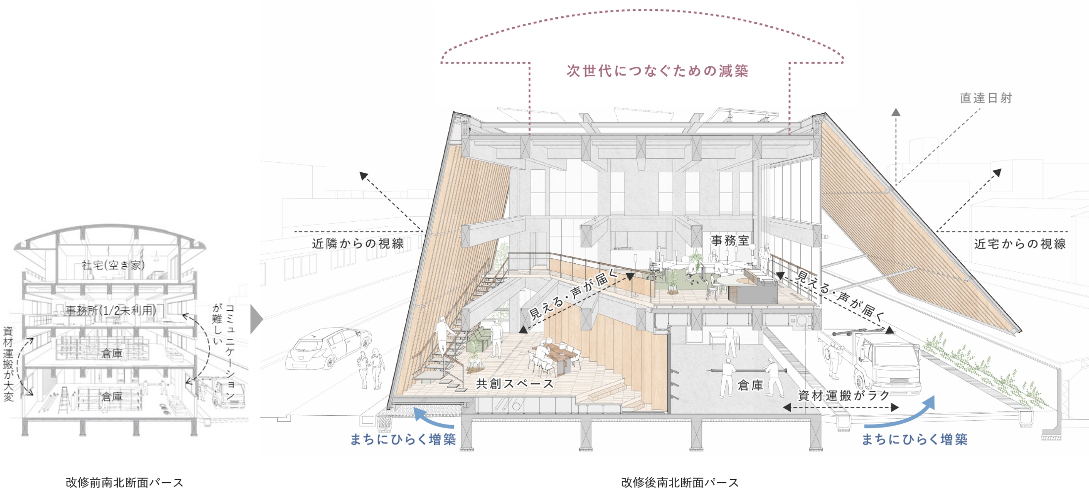 既存躯体を地形のようにとらえ、大胆な減築によって次世代に建築をつなぎ、人や地域にひらいていくことで長く愛され続ける建築を目指しました。