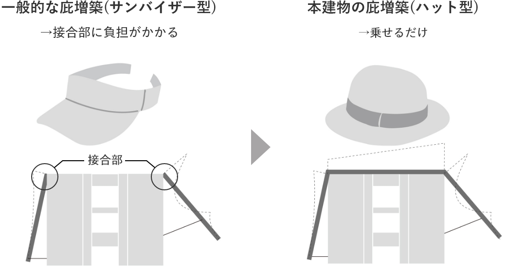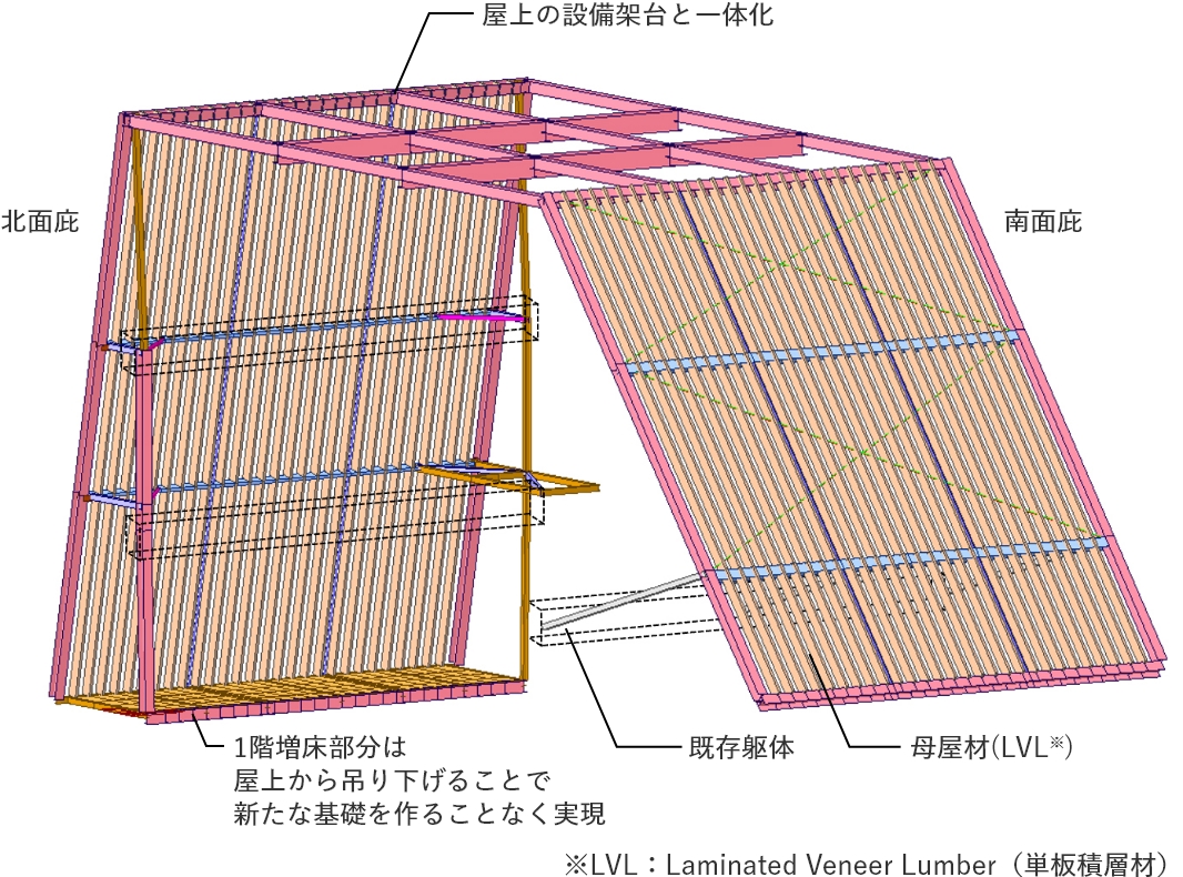 増築した南北の庇や1階増床部は、既存躯体屋上から吊り下げた鉄骨架構により支持することで新設基礎をつくることなく実現しました。さらに吊り下げた鉄骨架構は引張材とすることで、スレンダーな断面としています。また屋上設備架台と一体化し既存躯体に被せるように配置することで、既存躯体接続部に大きな応力が生じない優しい架構計画としました。