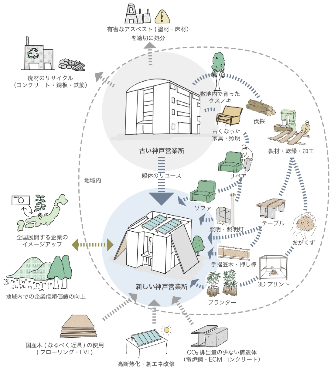 既存躯体活用により、工期を40%短縮し、解体による騒音・振動の大幅低減と廃棄物の7割削減が実現しました。新設部では木材利用、電炉鋼・高炉スラグ微粉末を含んだコンクリートを採用し、新築と比べて建設時のCO2排出量を70%以上低減しました。新たに付加する材料は、なるべく近くから取り寄せるなど輸送時CO2の削減や国内林業の活性化も意図しました。