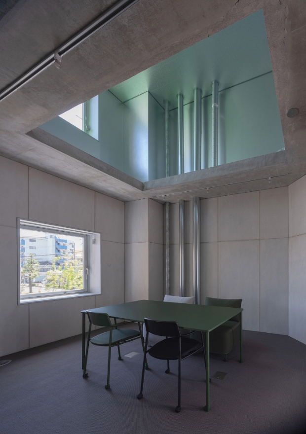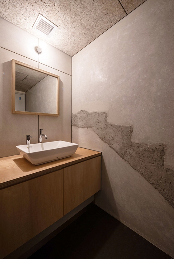 建物にはいつか終わりが来ます。それは、「物質的な寿命」が来た時ではなく、飽きられ「愛着の寿命」が尽きて見捨てられた時であることが多いと思います。だからこそ、これまでこの場所で一緒に時を刻んできた既存躯体の力を借りて、建物への愛着へとつなぎたいと考えました。解体した階段の痕跡を壁面に残したり、新築当時書かれた通り芯の跡を残したり、面積が限られたコアの会議室はスラブを撤去することであえて天井高の高い部屋にしたり、きれいにしすぎるのではなく、躯体を残すからこそできる空間をつくりました。