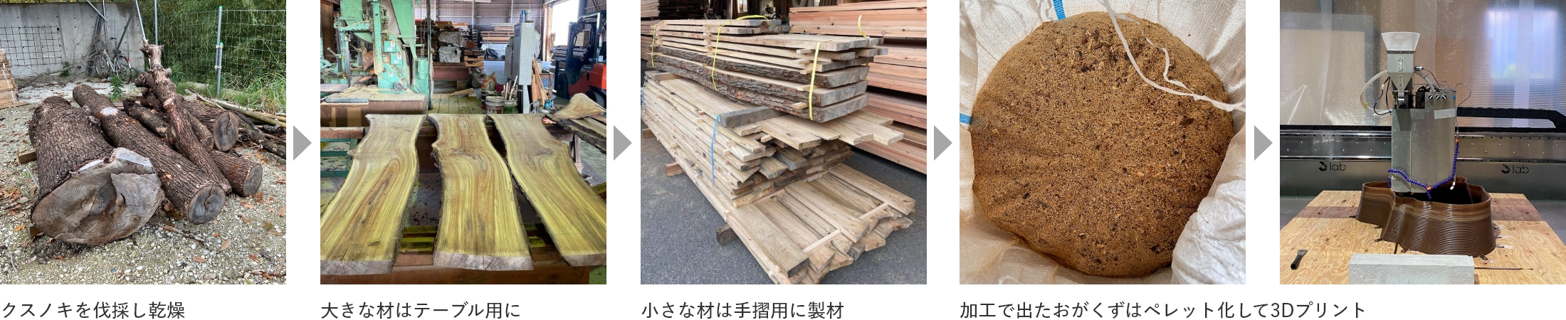 強剪定されて痛々しい見た目になっていた敷地内のクスノキは、テーブルや手すりなどの手が触れるものに転生し、余ったおがくずも3Dプリントして植栽プランターとして再生しました。もとからあった照明器具や家具もリメイクして再利用しています。