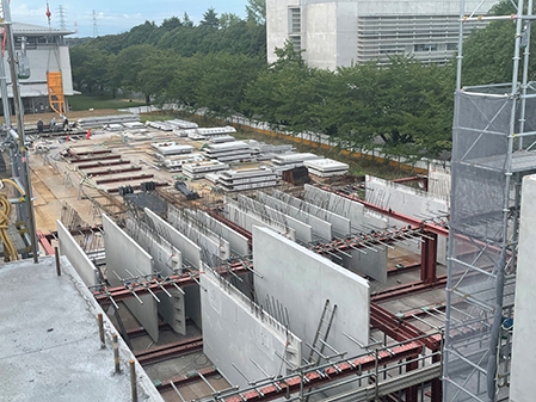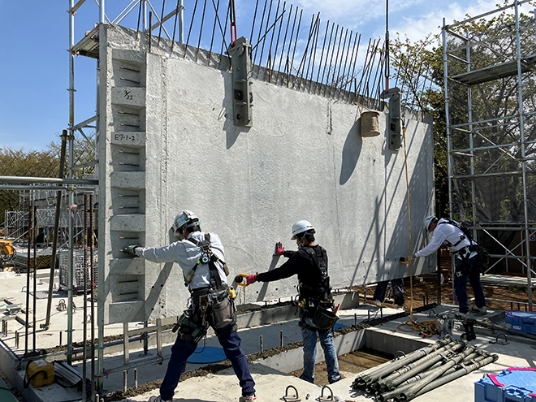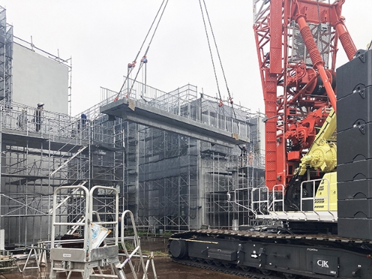 住戸ユニットは5.9mの妻壁と2層分の開口部を設けた7mの壁・壁梁によるPC壁式構造を採用しました。各ユニット間はハーフPC床板とプレストレス床板により接続しています。PC壁・壁梁は隣接大学敷地をヤードとしたオンサイト製作とすることで、運搬限界を超える大型化(約5.9m×3.2m)を可能としました。楊重半径と重機解体経路を考慮した配置計画、揚重範囲内への効率的な縦置き架台の設置、PC形状や重量に対応した専用吊り上げ治具の開発により、施工効率を上げ取付精度を高めた躯体PCは、少人数の多能工による施工が可能となり、在来工法比で労務効率は約20%向上、工期は35%削減する効果を上げました。併せてオンサイト化により在来工法比で約27tのCO2削減を達成しました。