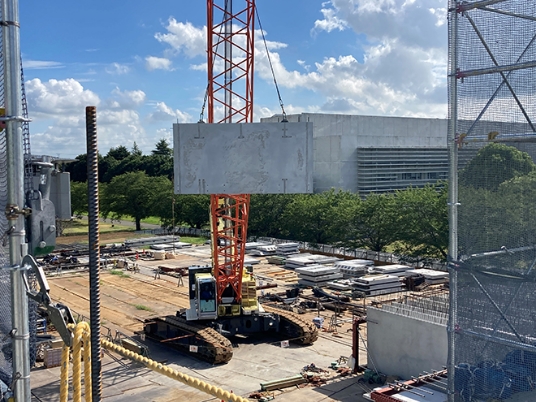 クレーン回転軌跡を考慮した配置計画、隣接する大学敷地7,000㎡を活用したPCヤード