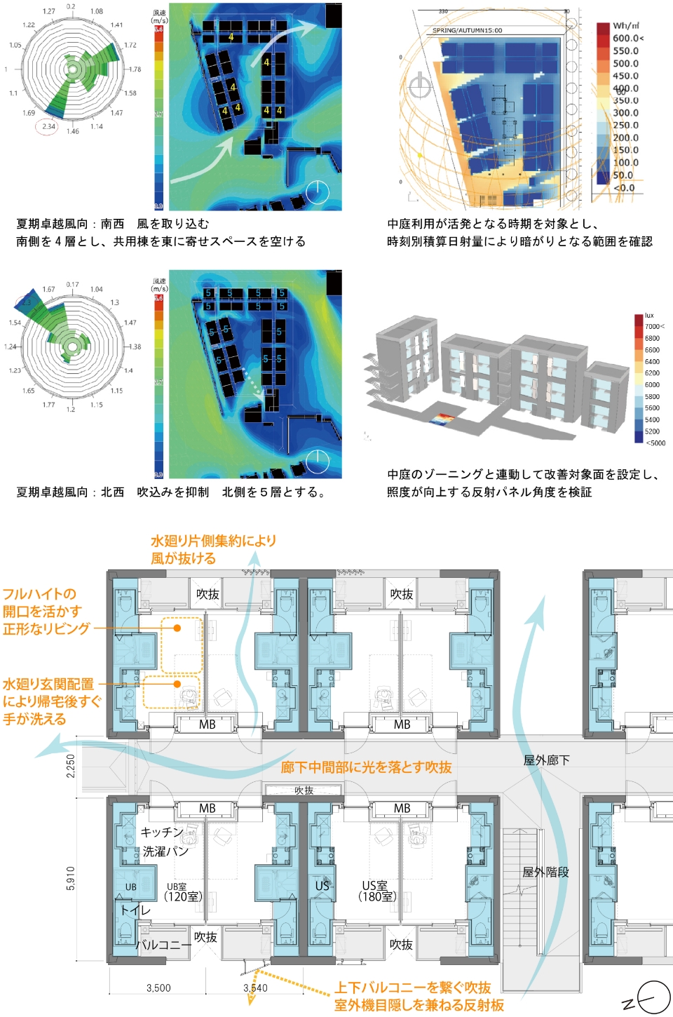 環境シミュレーションを行い計画に反映することで、外部空間の快適性を高めています。卓越風を夏期は最大限取り込み、冬は遮るように棟高さ、棟配置を決定、バルコニーの一部に反射パネルを設置することで中庭の光環境の改善を図りました。