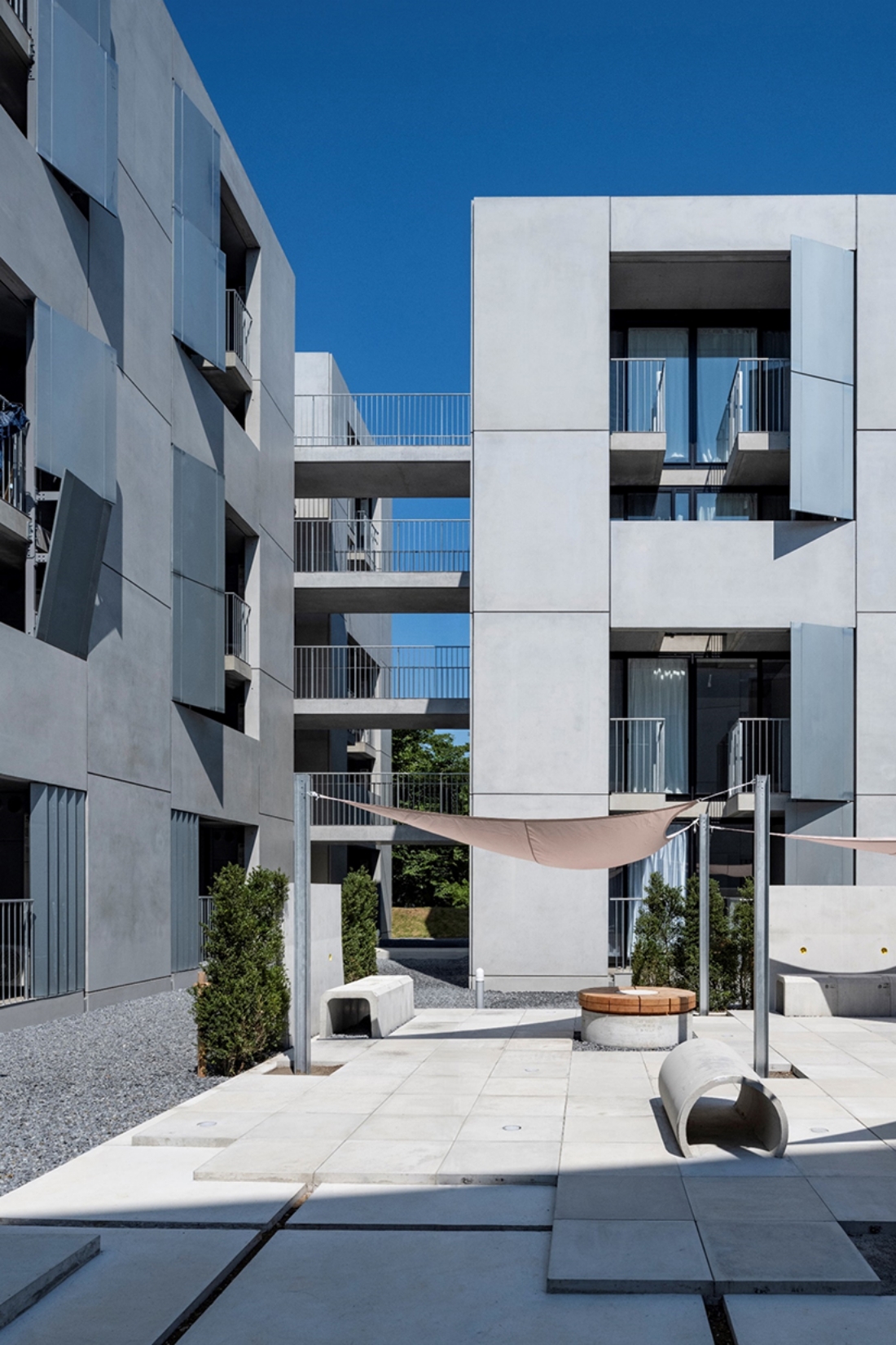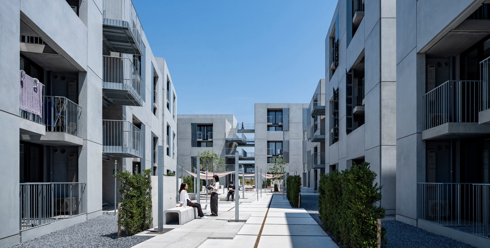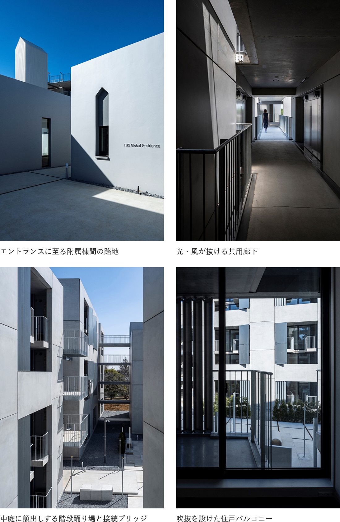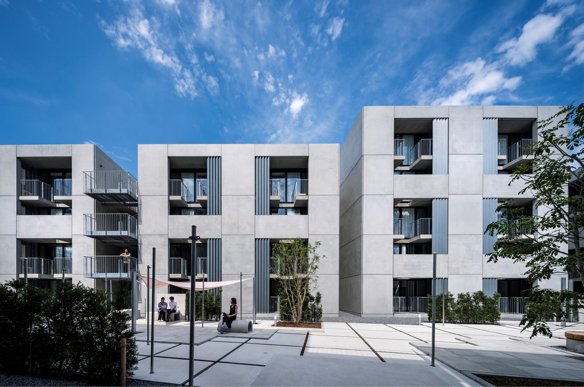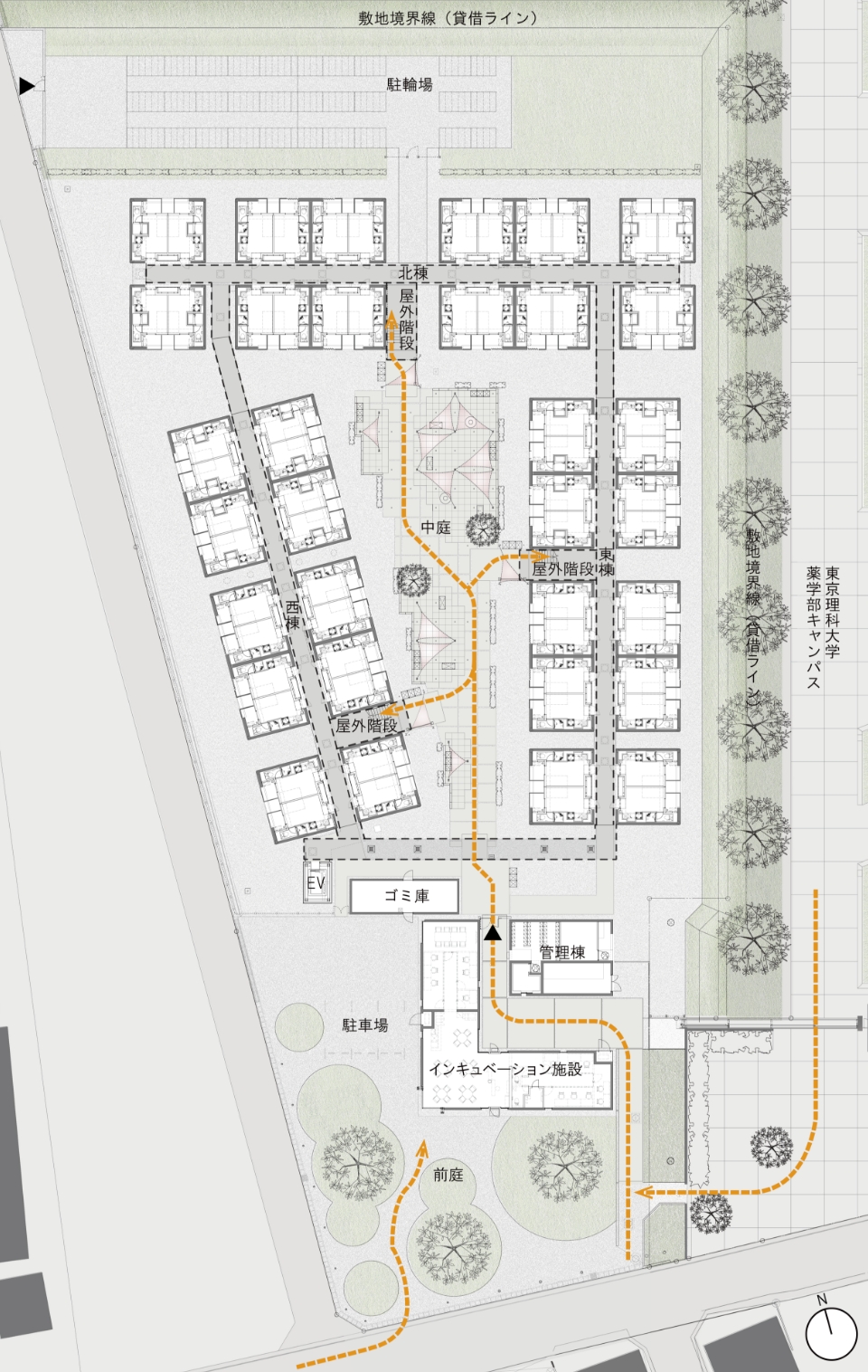 パンデミックを経て「集まって住むこと」を再考し、次の時代を見据えた集住モデルの創出を目指しました。4住戸1ユニットの分棟を外部経路によって繋ぎ、各棟1か所の外部階段から中庭経由のアクセスとすることで、外気下で物理的距離を保ちながら寮生の交流を促す計画としています。
