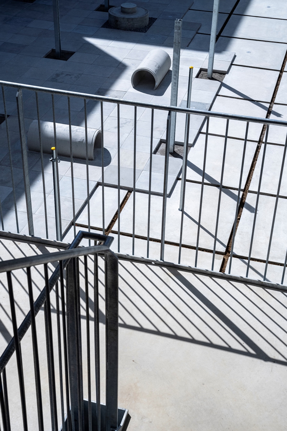 経路の起点となる中庭は、イベントや日常利用に際し、学生自らが能動的に様々な人数単位に合わせた活動の場を生み出せるよう配慮しました。コンクリート平板で手掛かりとなるスケールの場を緩やかに規定し、工業製品を転用したベンチや移動可能な単管パイプ、天幕を配置しました。