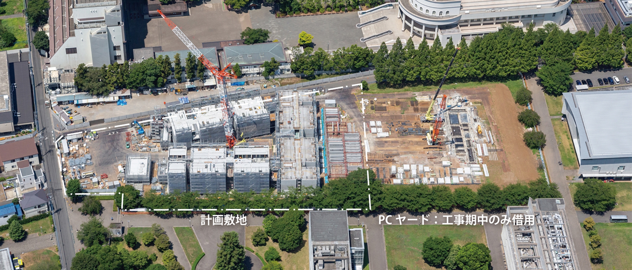 クレーン回転軌跡を考慮した配置計画、隣接する大学敷地7,000㎡を活用したPCヤード