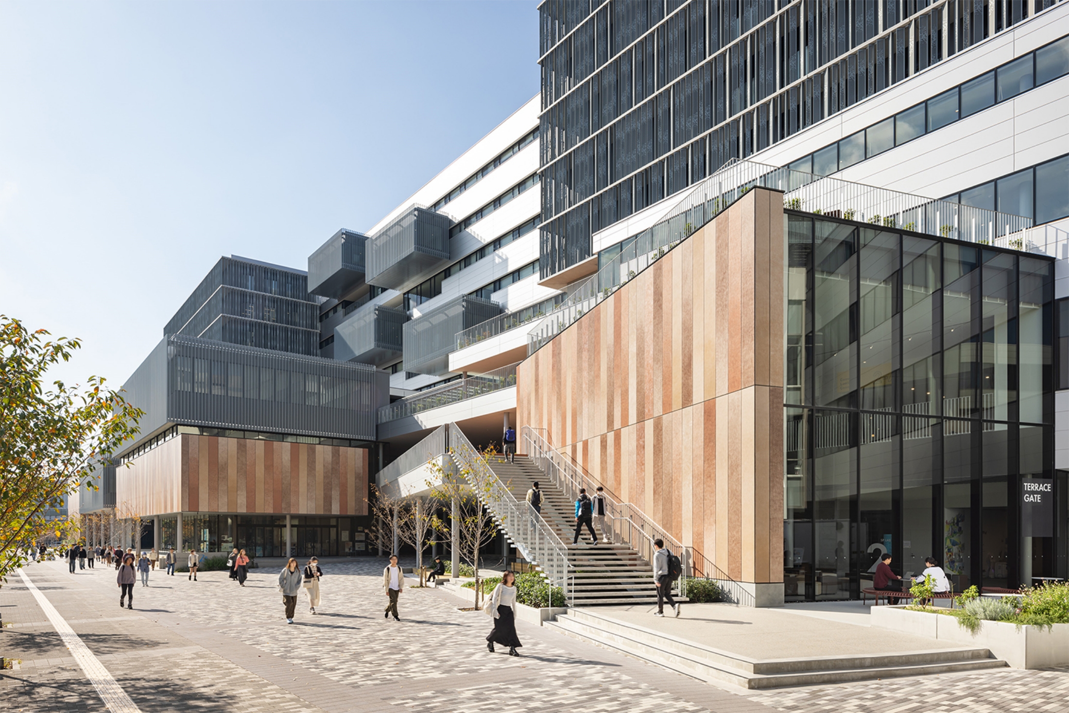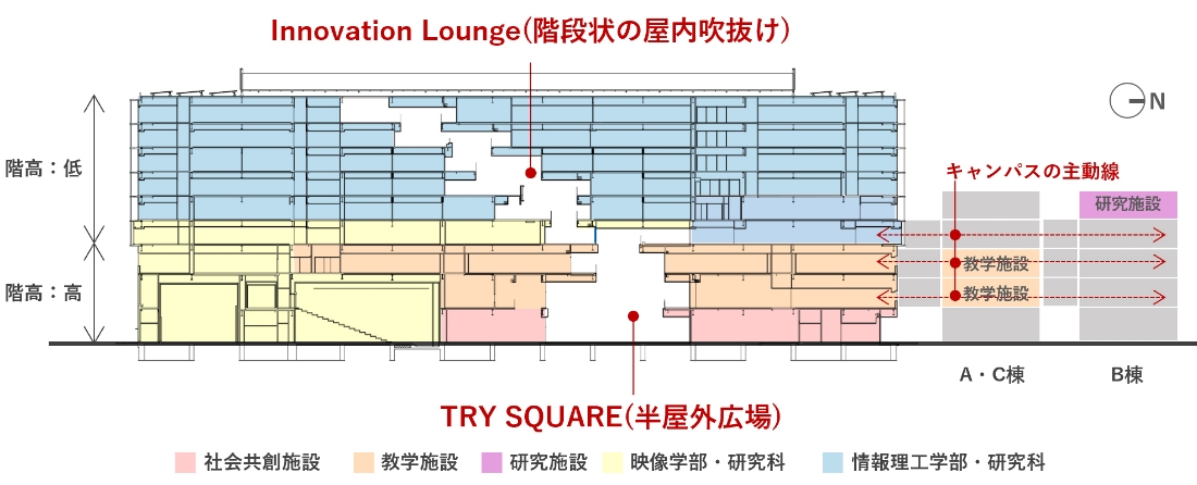 学部の垣根を超えた日常的な交流を促すため、キャンパスの主動線であるコンコースを継承しました。さらに、コンコースをTRY SQUAREへ接続し、テラスや屋外階段で4階まで連続させることで、フロアを超えたつながりや賑わいを生み出しました。