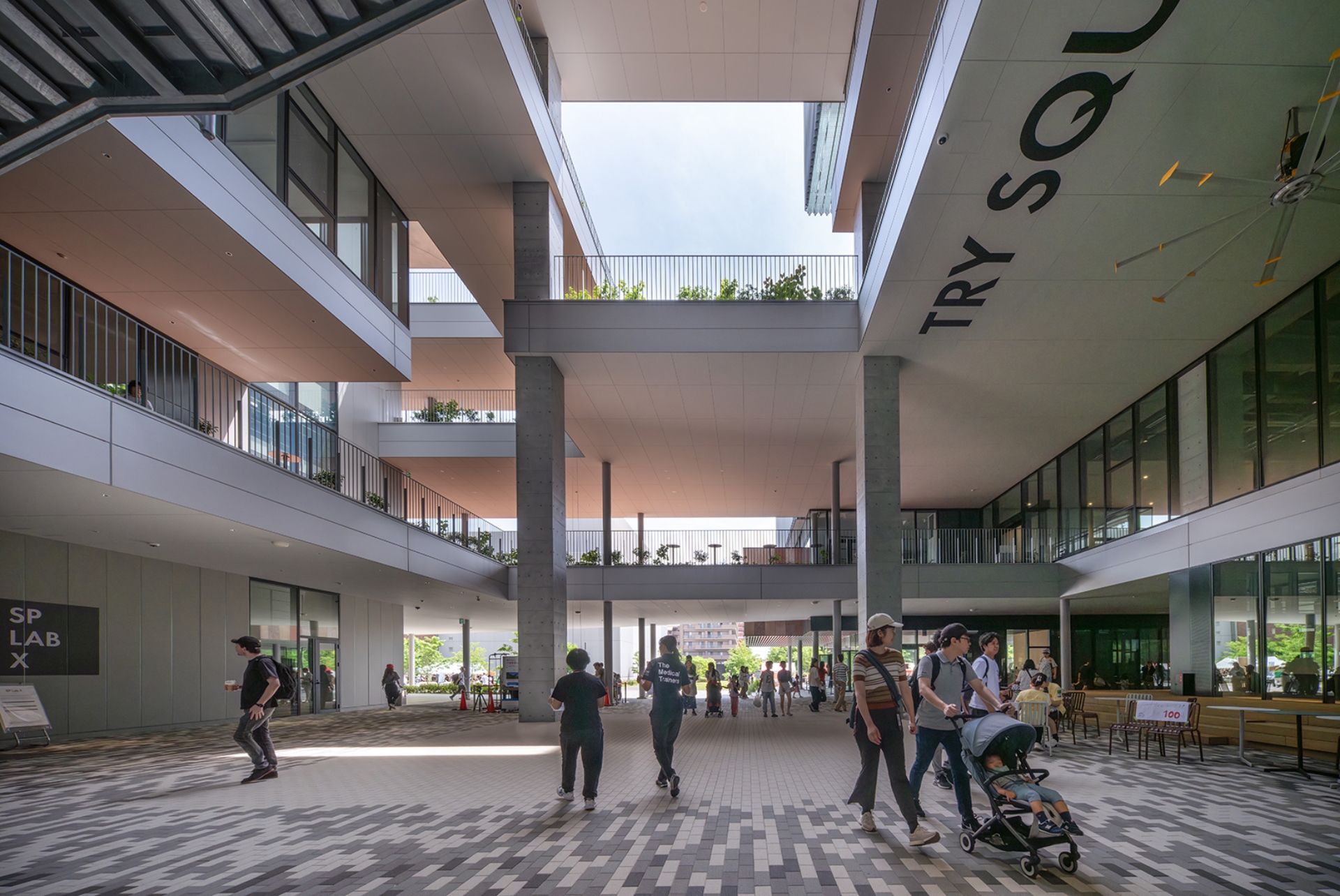 地域交流、企業・自治体との連携、研究成果を体験できる研究室など、社会共創を促す施設群をTRY SQUAREを中心に1階に配置しました。 OICの魅力(地域社会に開かれた/文理融合型)を活かし、多彩なプログラムと、新たな出会いを生み出す回遊プランにより、これまでの大学にはない共創拠点を生み出しました。