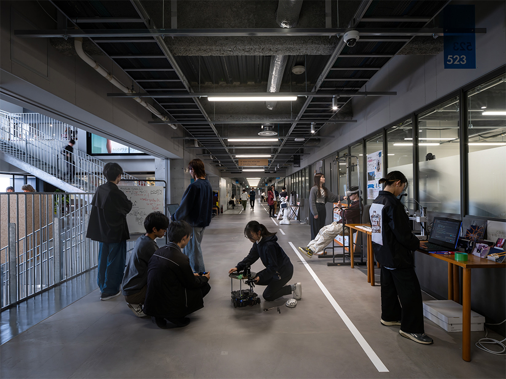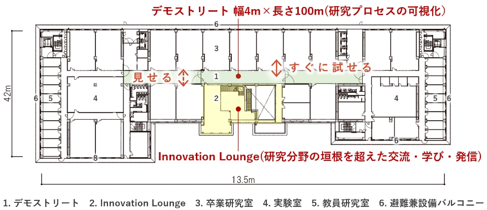 5~9階の研究エリアでは、研究室ごとに閉じこもるのではなく、研究プロセスを可視化し共有できる環境を目指しました。幅4m、長さ100mの「デモストリート」を設け、学生が試行錯誤しながら自由に場を変容できるスケルトン仕様としました。この空間を 「Innovation Lounge」に隣接させることで、研究の賑わいがフロアを超えて広がり、「やってみたい」という風土を育むことを意図しました。