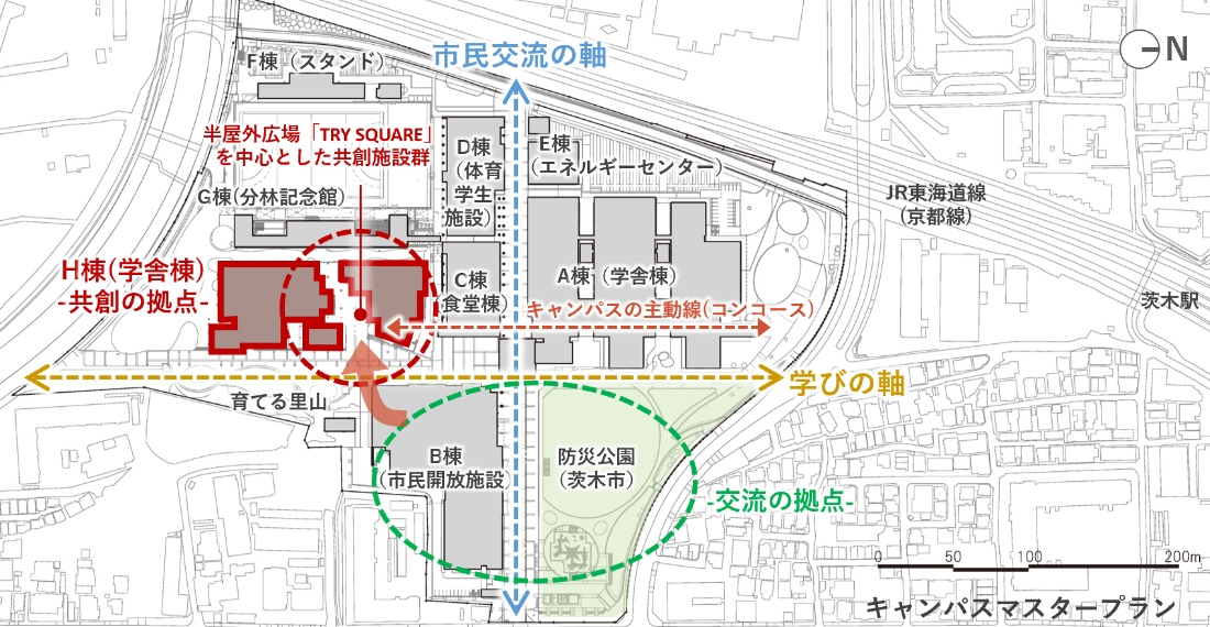 計画地は将来展開を見据えて確保していた場所です。OICは「学びの軸」と「市民交流の軸」によって構成され、防災公園と市民開放施設が交流の拠点になっています。本計画では、地域社会を引き込むために学びの軸に面して半屋外広場「TRY SQUARE」を挿入しました。さらに、建物ボリュームの一部を防災公園側に開くことで、H棟のシンボル性を強調しつつ、既存の交流拠点とTRY SQUAREとのつながりを生み出しました。
