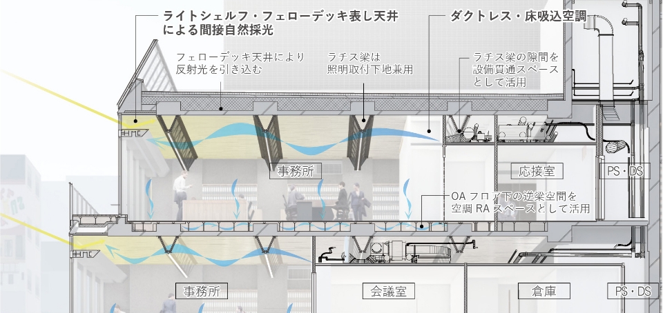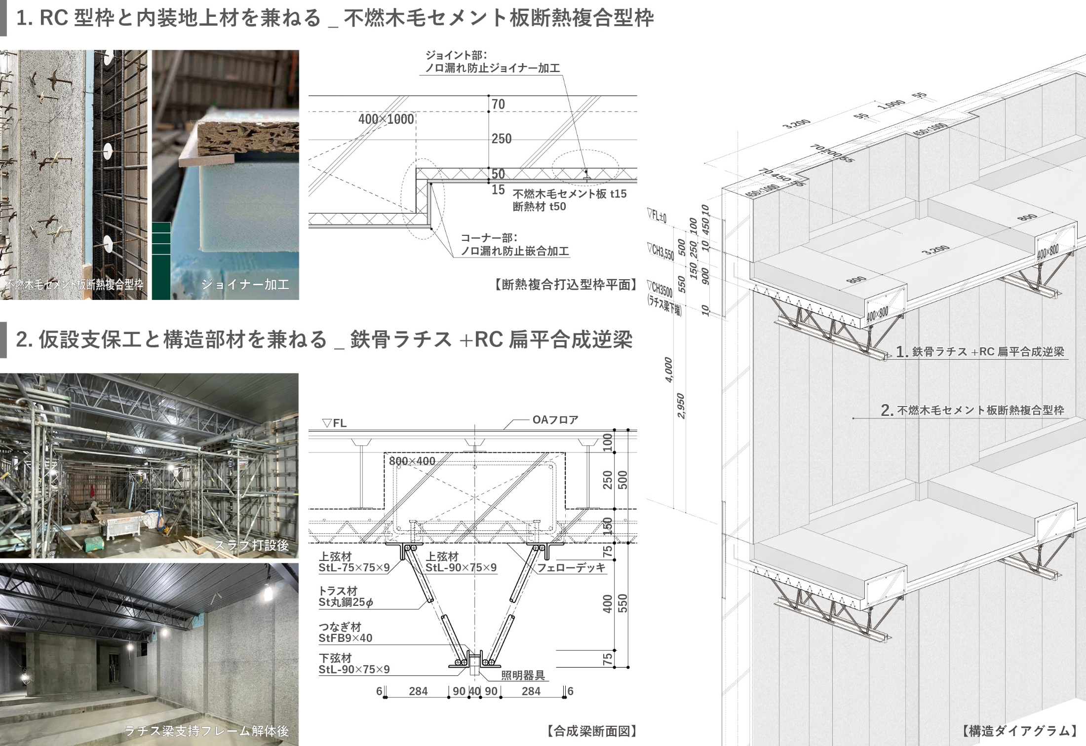 計画地は接道がアーケード側のみ、その他三方向は建物に囲われているため、工事においては建設資材の搬出入時間制限や大型揚重機の設置、資材ヤード確保の困難さが課題でした。そこで本計画では、仮設材と仕上材を兼ねた構工法を考案して施工上の課題を解決しました。搬出入資材量削減のため、型枠には木毛セメント板と断熱材を接着した複合板を打込型枠として用いました。また、仮設支保工と構造部材を兼用するラチス梁の採用により、仮設解体を不要とするとともに、打設後の施工スペースを確保することで生産合理性を向上させています。