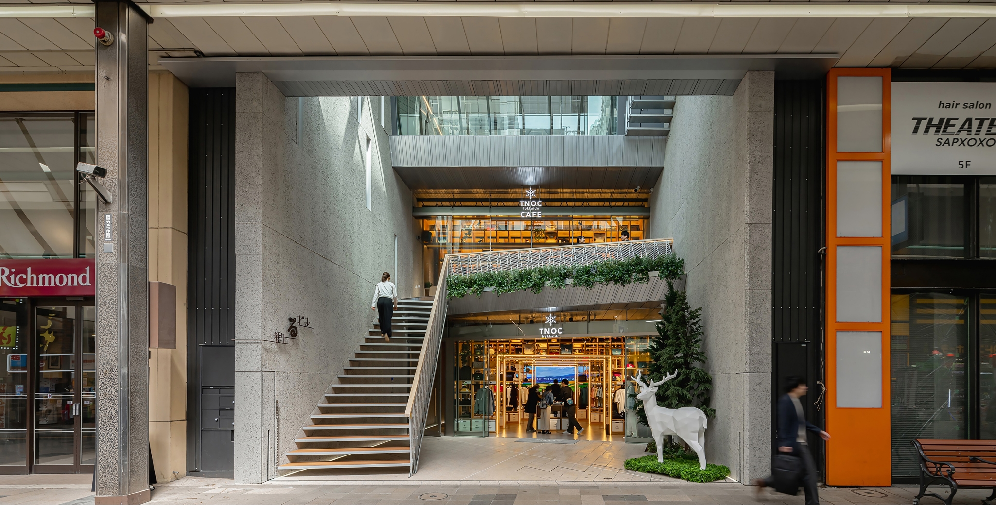 狸上るビルは、閉ざされがちな雪国の全蓋式アーケード商店街において、「街に開かれた広場空間の創出」と「施工的制約の解決から付加価値を生む、ものづくり手法の構築」を試みています。壁面をセットバックしたスペースにトップライトを架けた半屋外のポケットパークに、2階への階段や、空を望めるテラススペース、3階との視線を繋ぐガラススクリーンを設けて、建物とアーケードの関係性を立体的に拡張しています。