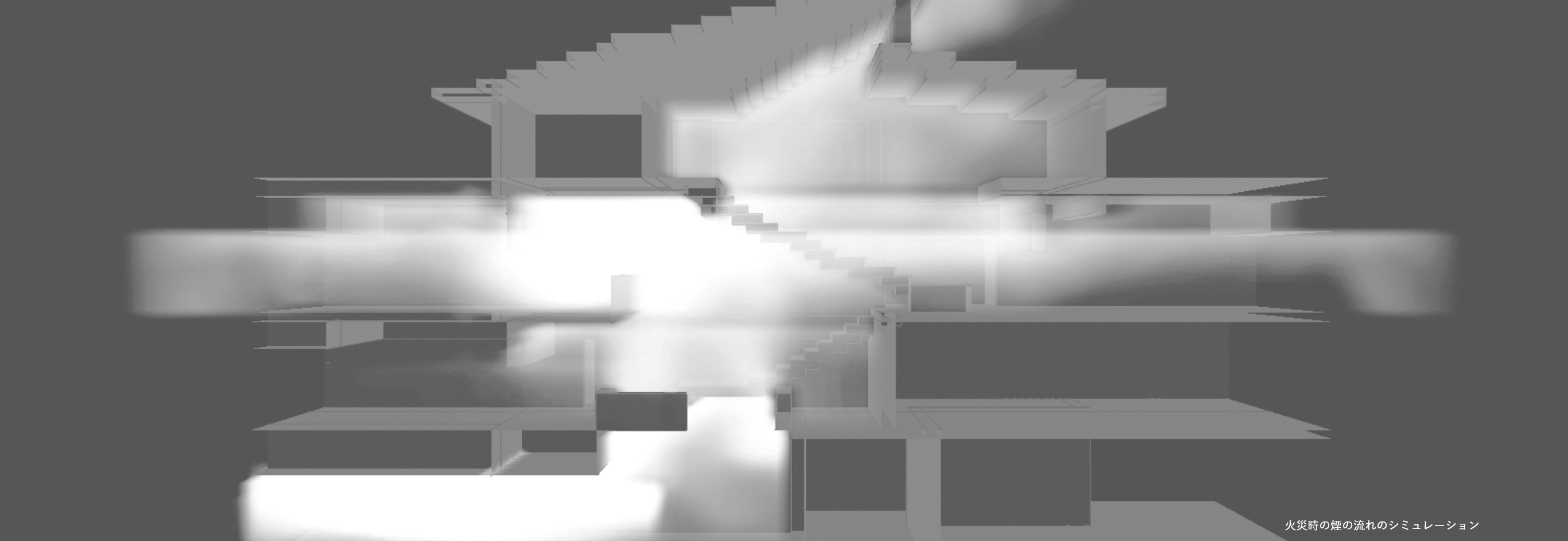 私たちは、建物の平⾯・断⾯構成や使われ⽅を読み解き、⽕災の規模・被害範囲を明確にし、煙の流れ・人の流れを解析することで、⼈が安全に避難できる計画を⽴案します。