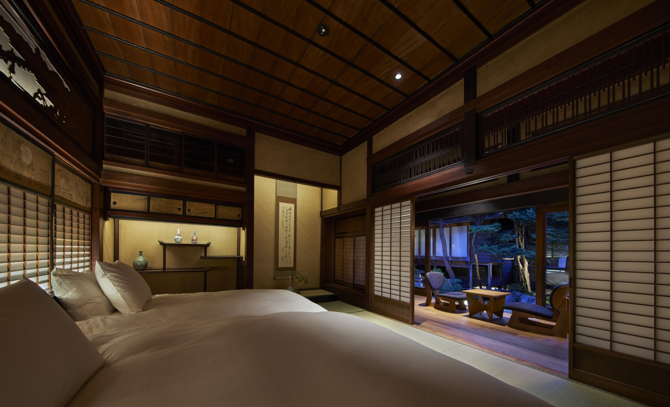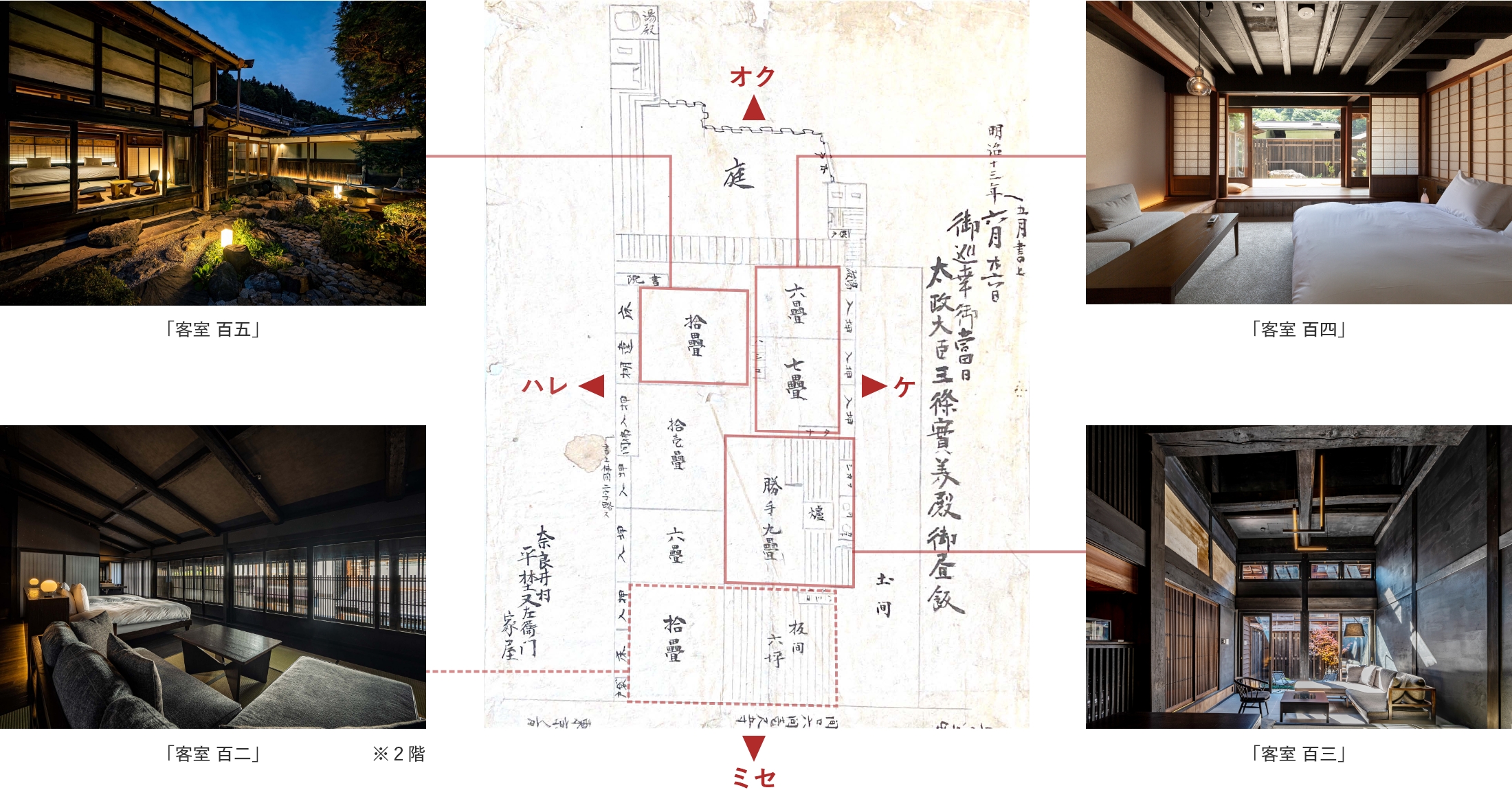 8つの客室それぞれに異なるテーマを設定しています。表通りに面したミセのフロントは「質素で堅実」、表通りから見えない中庭に面したオクの書院造が残る客室は「格式と趣味性」、主人や客人の使うハレの空間は連続する座敷による「様式の継承」、使用人が使うケの旧勝手場は天井を解体し小屋組みを現しとした「崩しや数寄」などです。また、旧家財蔵はメゾネットの客室として転用しました。