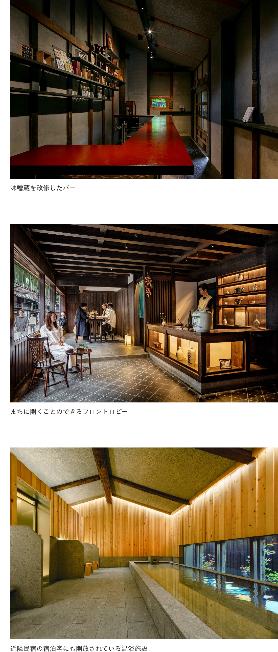 地域の活性化に寄与することを目指して、味噌蔵を改修したバーや、まちに開くことの出来るフロントロビー、近隣の民宿の宿泊客にも開放した温浴施設など、宿泊客と地域を繋ぐ憩いの場として公共性の高いスペースを設けました。
