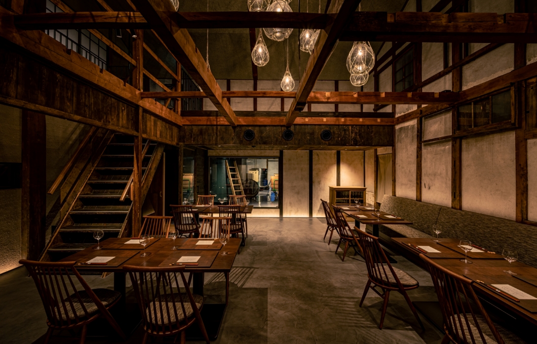 天井から吊られた照明は、仕込み蔵に保管されていた一斗瓶をアレンジした特注照明です。椅子は松本民芸家具のウインザーチェアがモチーフになったものをセレクトしました。料理の器には地域の名産品である木曽漆器を使用しています。