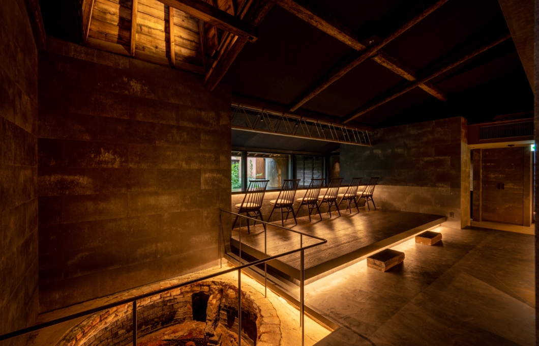また、レストランのカウンター席の脇には、酒造りの最初の工程である米を蒸すための巨大な窯場の遺構を残しています。