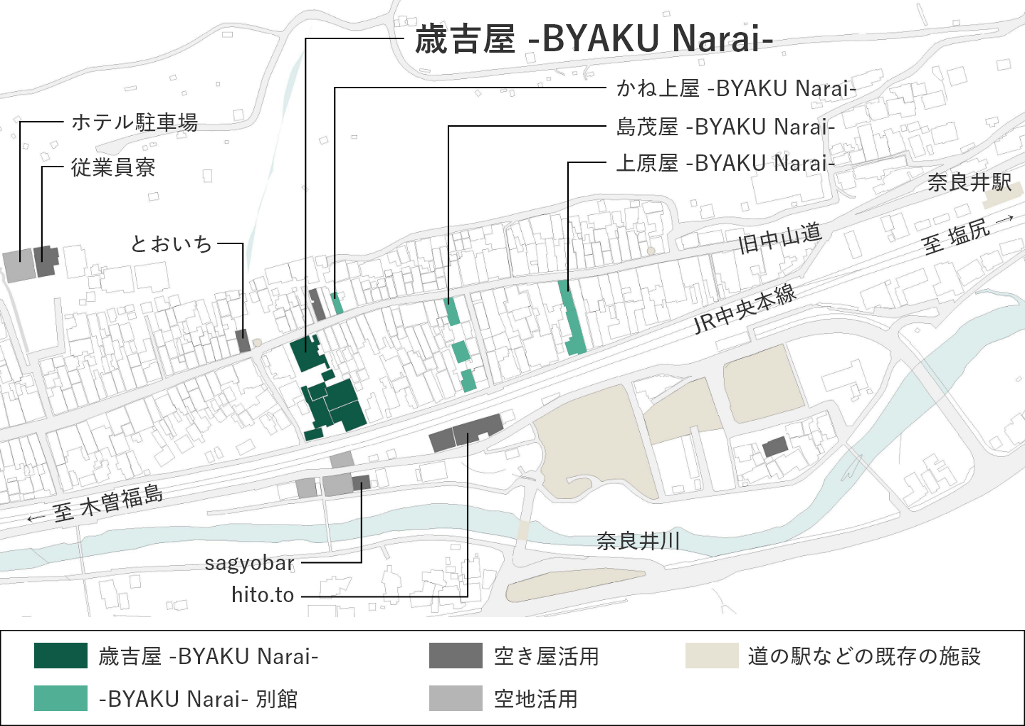 また現在では、この歳吉屋 -BYAKU Narai- を足がかりにして、まちに点在する空き家を別館客室に改修する「まち分散型ホテル」へと展開されています。