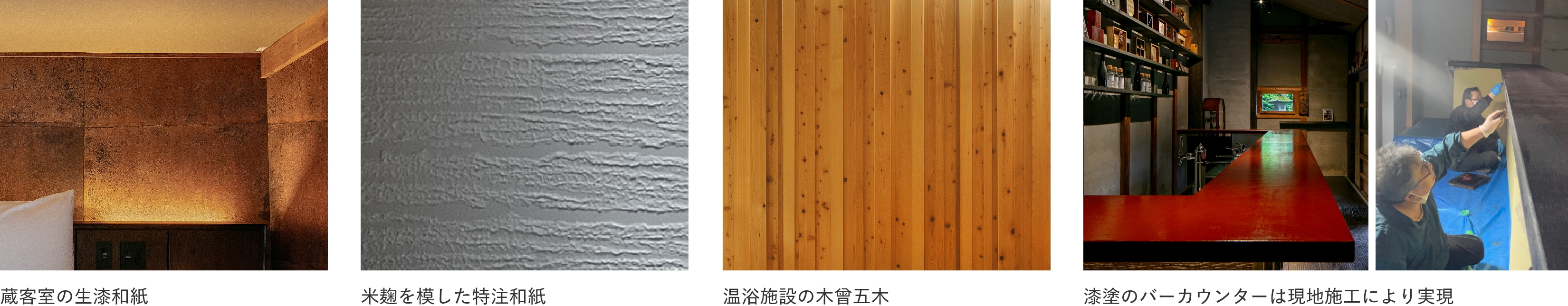 木曽の伝統工芸である漆は客室の床材や漆和紙、地元職人が手掛けた漆喰壁として採用しています。また、地場材であるミズメザクラをミニバー天板の造作、酒麹を彷彿させる凹凸のある襖紙、ハンドスクレープ加工したフローリングなどに使用しました。