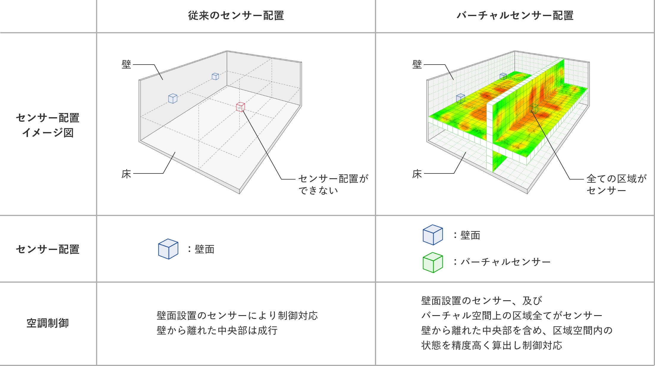 大空間における空調制御の難しさは、その空間の性質上、温度制御をするためのセンサー配置場所が、内周壁面などに限られ、壁面から離れた中心部などにはセンサーが設置できない事です。このため、壁面に設置したセンサーにより空間全体を空調制御しますが、センサーから離れた範囲に、空調負荷となる熱の発生量にバラツキがある場合、この熱を直接測定出来ない為、快適さにもバラツキが生じ、必要以上に空調エネルギーを使ってしまうという問題がありました。