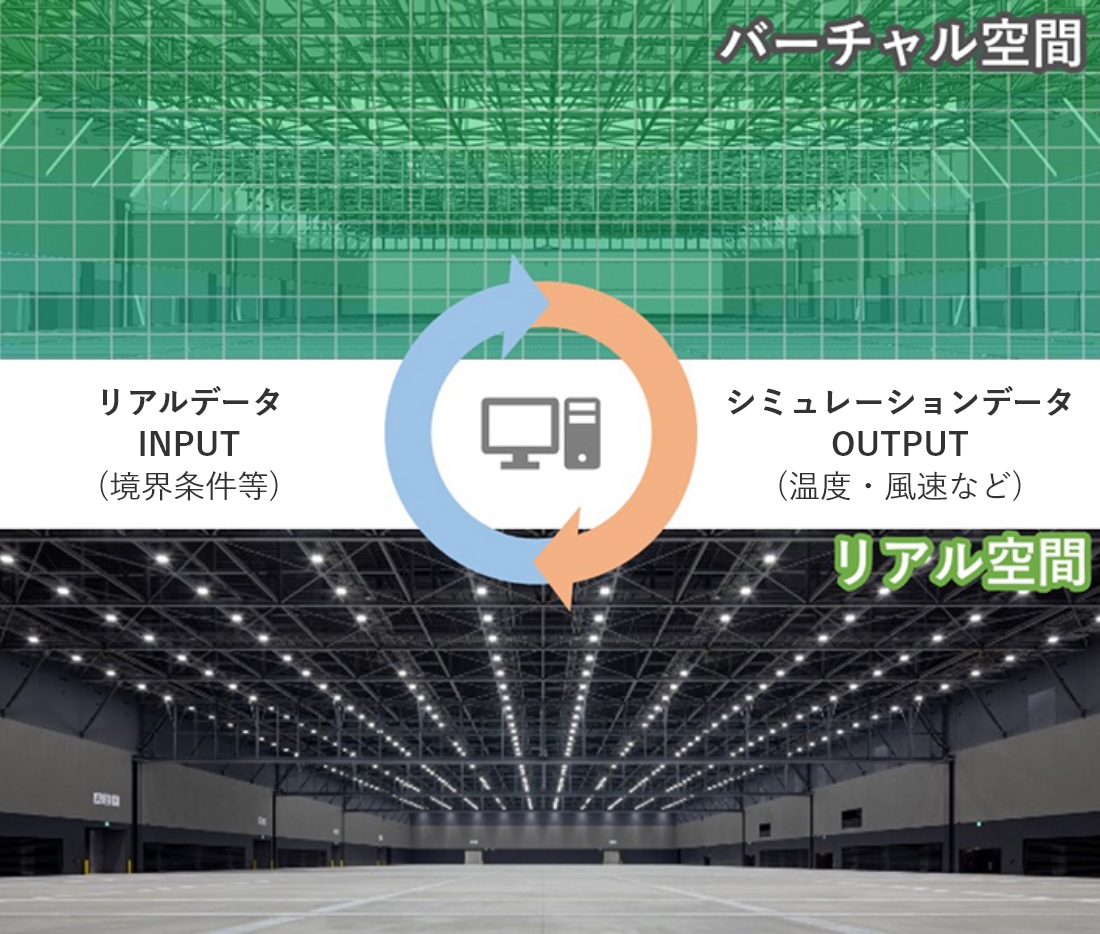 この問題を解決するために、コンピューター上にバーチャル空間を作成、実際に設置した温度センサーなどからの測定情報を取り込み、シュミレーションを実行することにより、大空間内に膨大な数のセンサーを取り付けたのと同様な空調制御を実現できる、日本初のデジタルツイン環境を創出しました。これにより、センサーを数多く設置することができない大空間でも、細かい部分まで配慮した空調の制御を可能としました。
