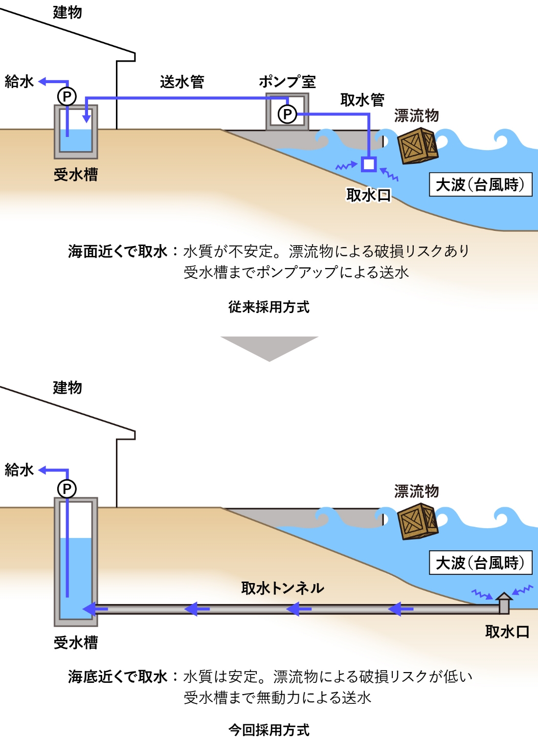 海からの新鮮な海水の供給は、水族館にとって生命線です。海水の取水方法は複数ありますが、従来から採用されている海面近くの海水を取水する方式だと、台風による漂流物や津波による被害を受けやすくなります。
