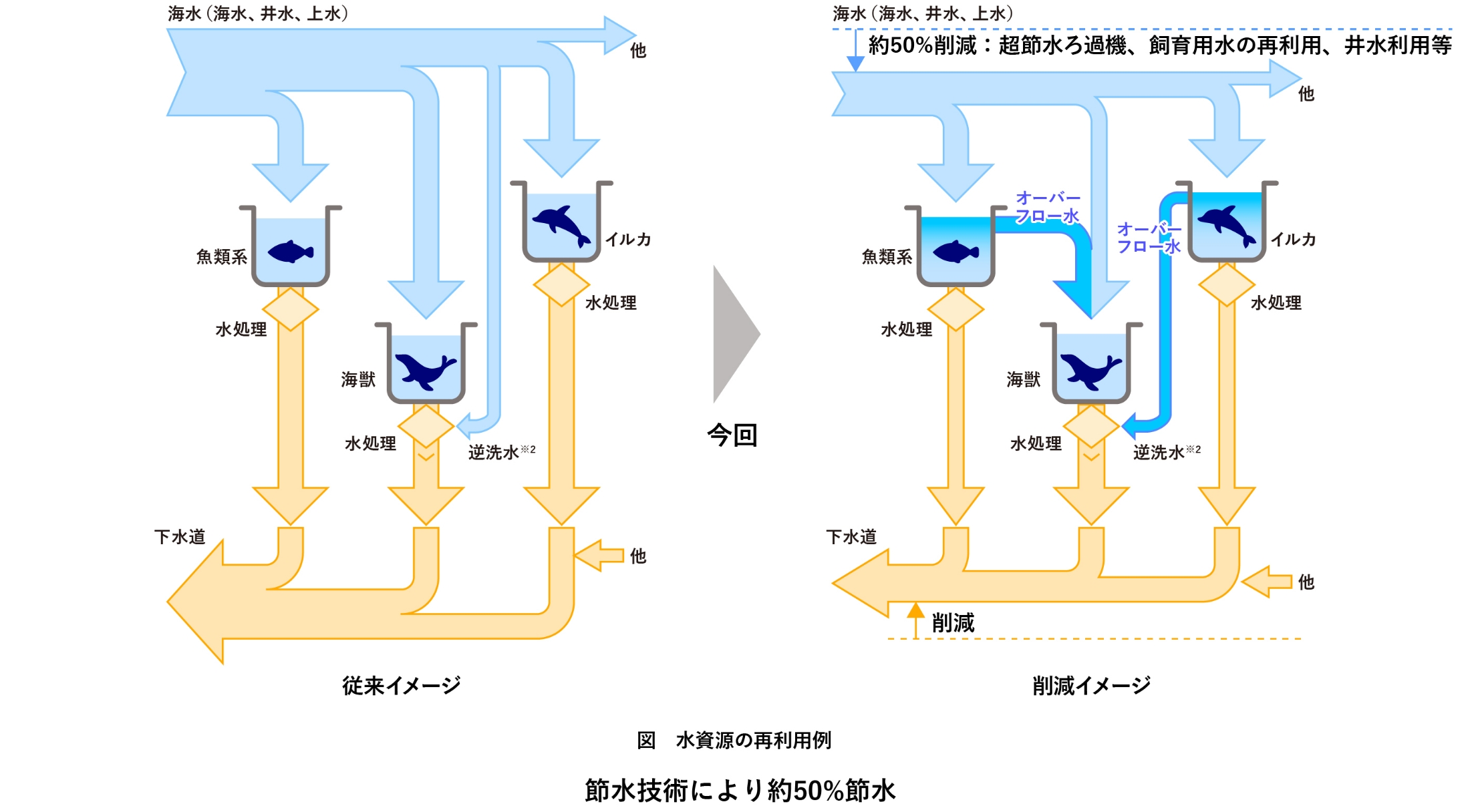 多種多様な生物を飼育する大規模水族館では、生物により求められる水質も異なるため、それを逆手にとって、水質の良い水槽からのオーバーフロー排水等を他の水槽に再利用することで、海水使用量の大幅な削減が可能となりました。また、超節水型のろ過器導入※1や井水利用を組み合わせて運用することで、既存水族館と比較して約50%の節水が可能なシステムを構築しました。