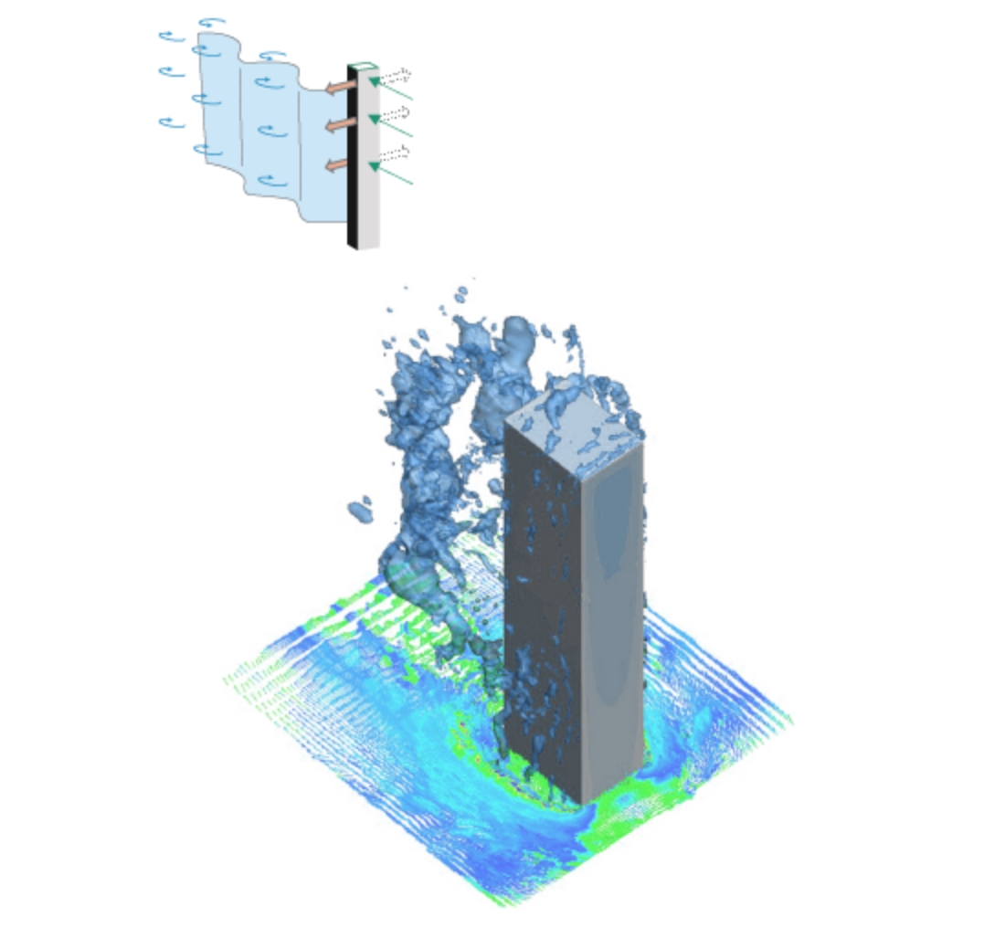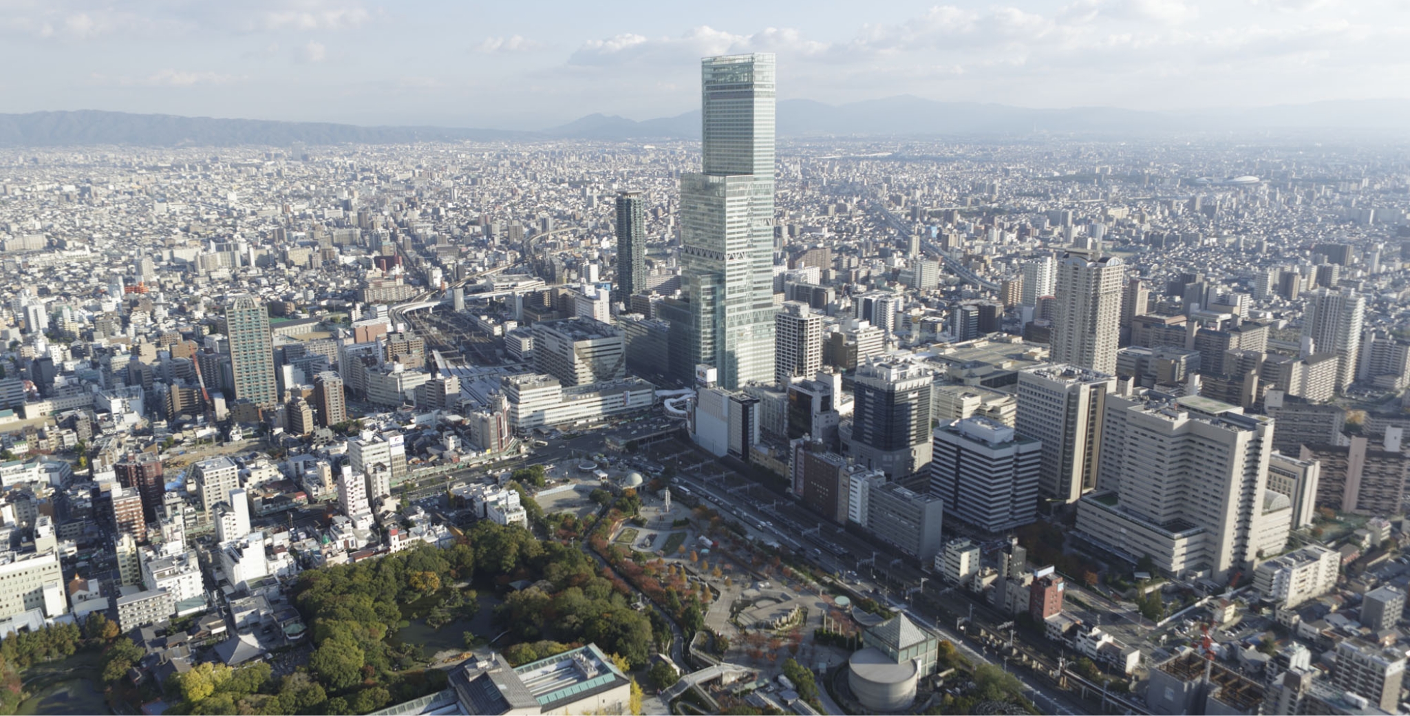 建物に強風が作用すると、建物風下側にカルマン渦(*3)が発生し、風向きと直交方向へ建物を揺らす現象が生じます。直方体形状の場合、数百年に1回程度の強風では地震と同等以上の外力となることが想定されました。あべのハルカスでは百貨店、オフィス、ホテルの大きさや形状が異なることを建物のかたちにも活かし、カルマン渦の周期を高さ方向で変化させ同時発生しないようにし、建物に作用する風の力を抑制しています。