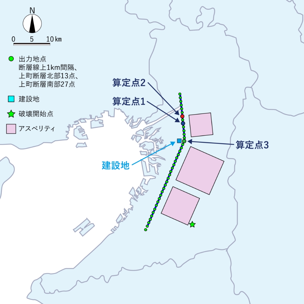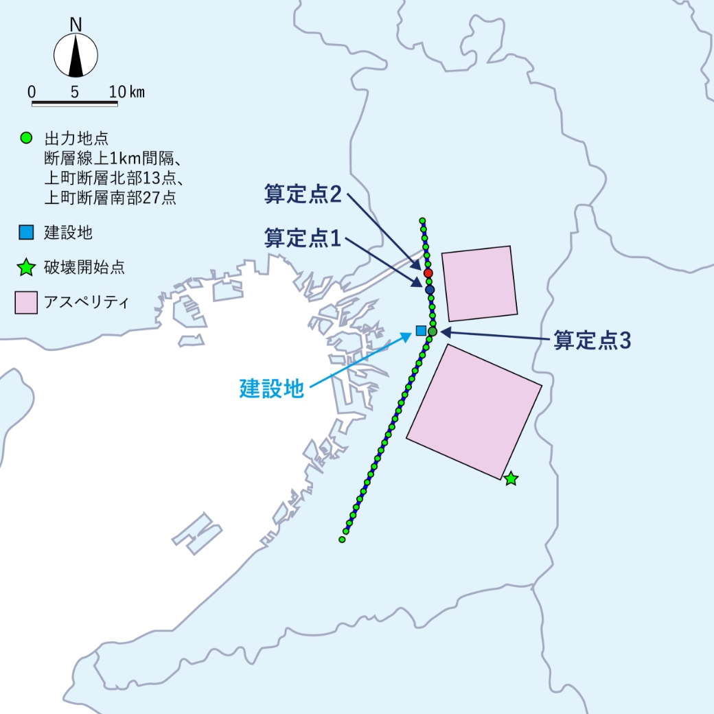 さらに、左下図中に示した上町断層上の別の出力地点40地点の地震動のうち、建物の1次・2次・3次固有周期に近い卓越周期をもつ地震動(下図中の3つの算定点)を意図的に抽出し、追加で安全性の検討を行いました。