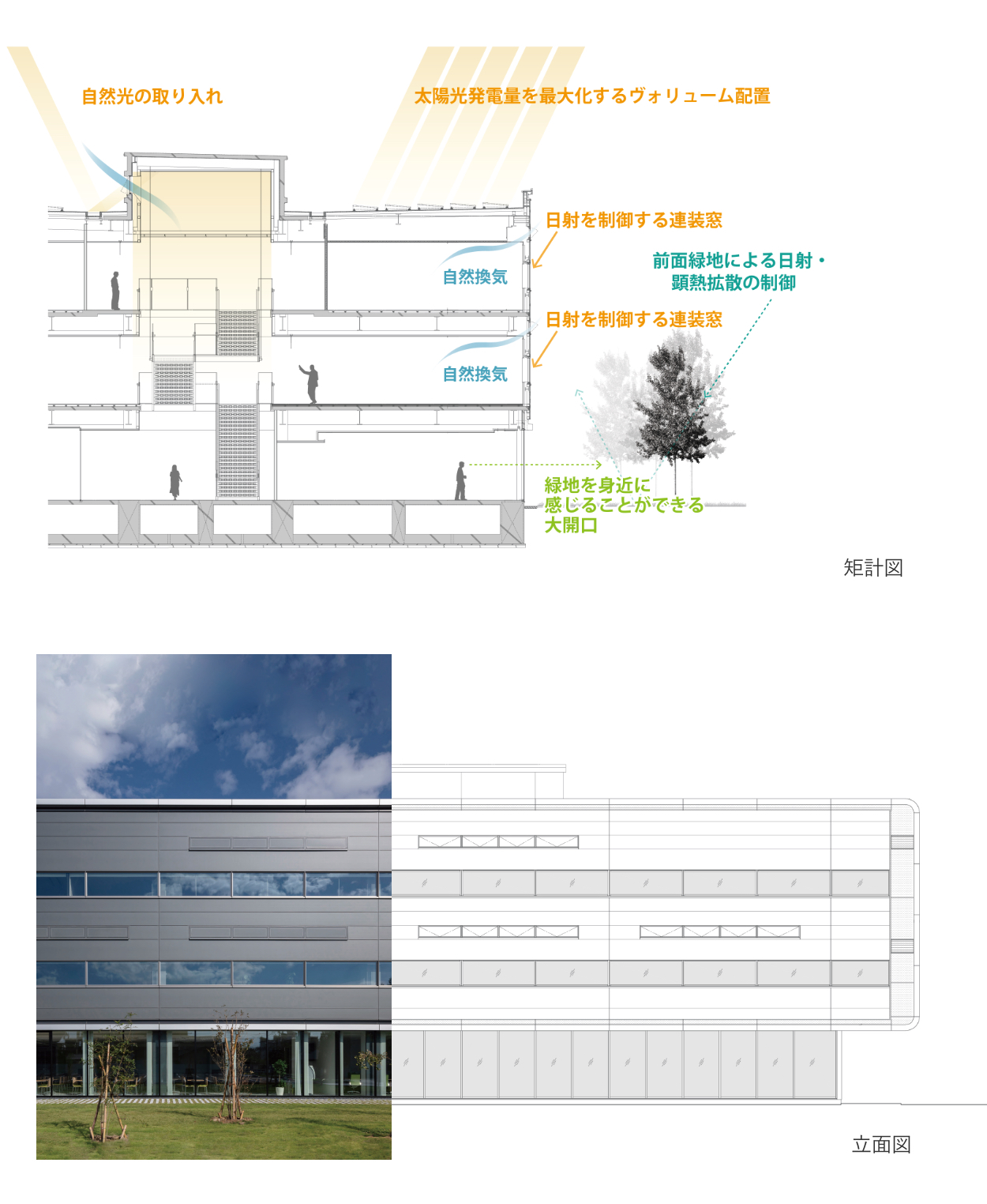 自然採光、自然換気による照明、コンセント負荷の低減と高効率なパッケージエアコンの採用による空調システムの省エネ化を図りました