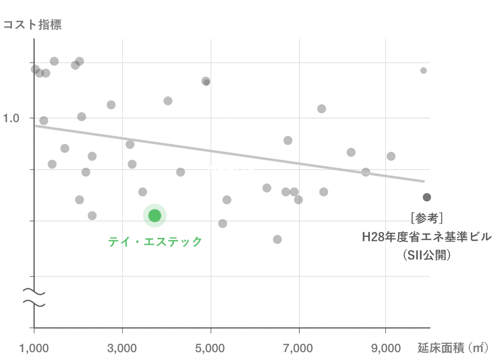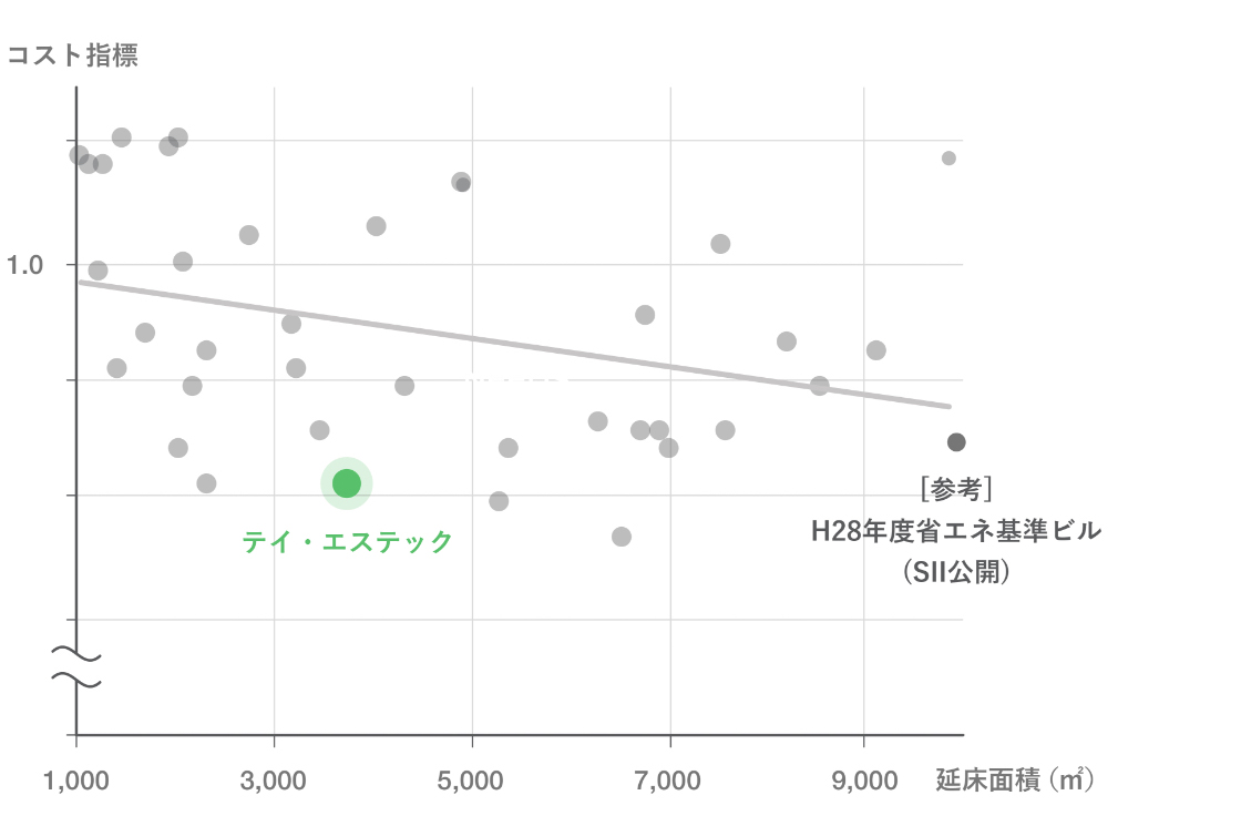 建設費は当社中規模オフィスビル(延床面積1,000~10,000㎡)の平均工事費を下まわり、一般オフィスビル程度の建設費でNearly ZEBを実現しました。